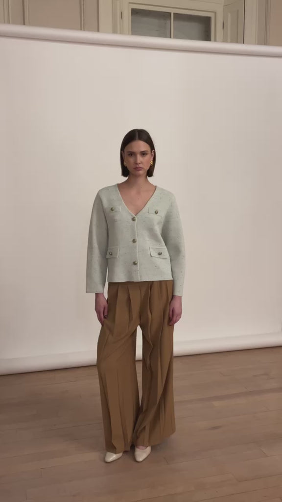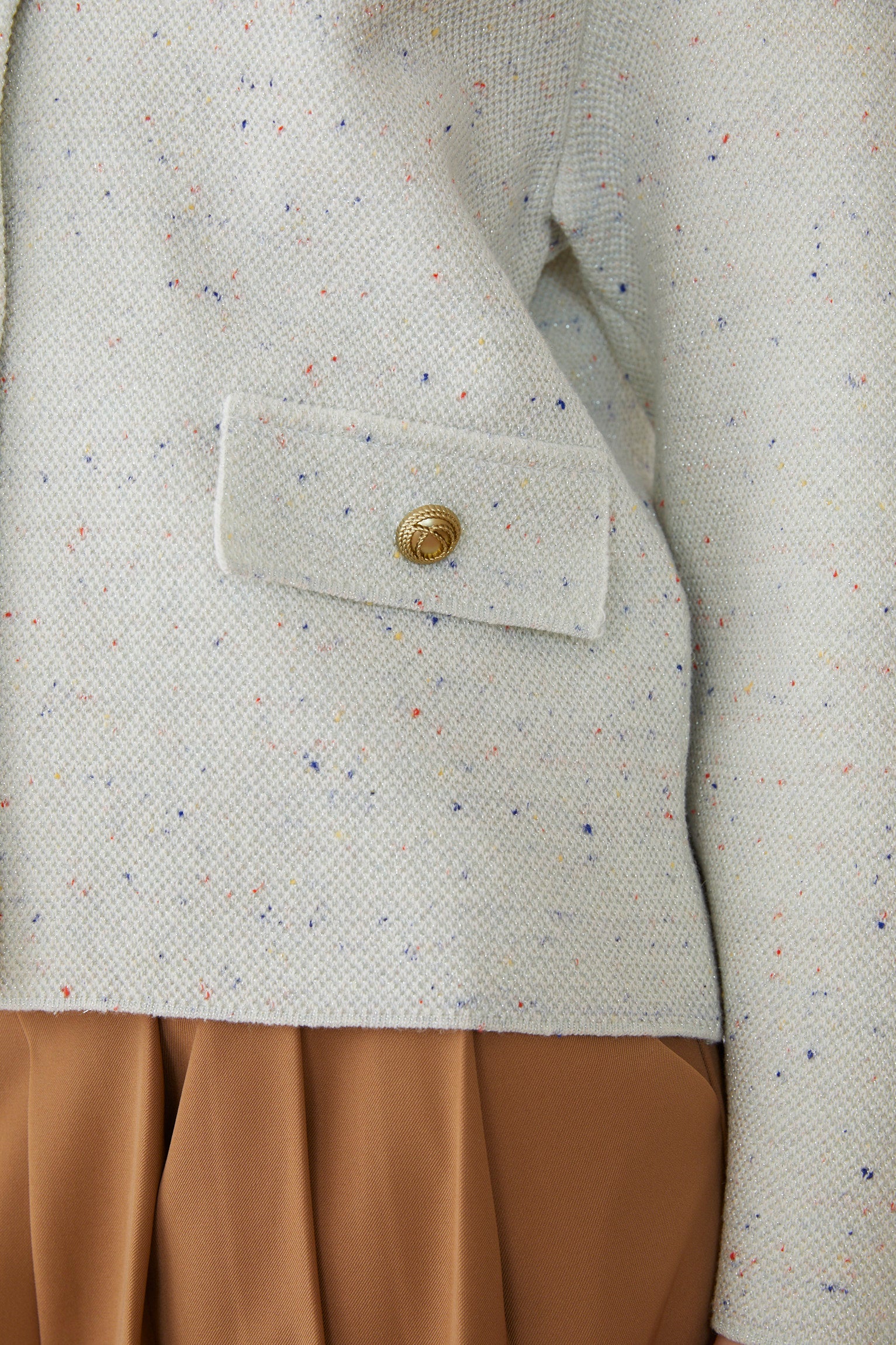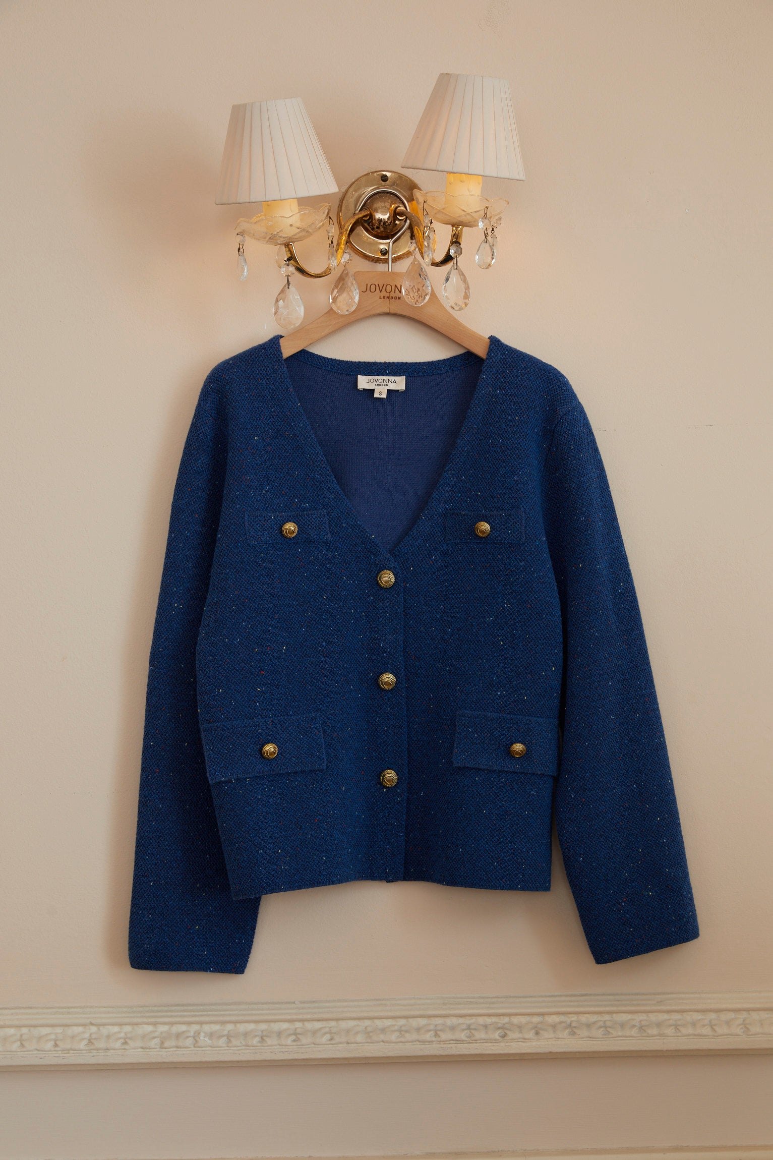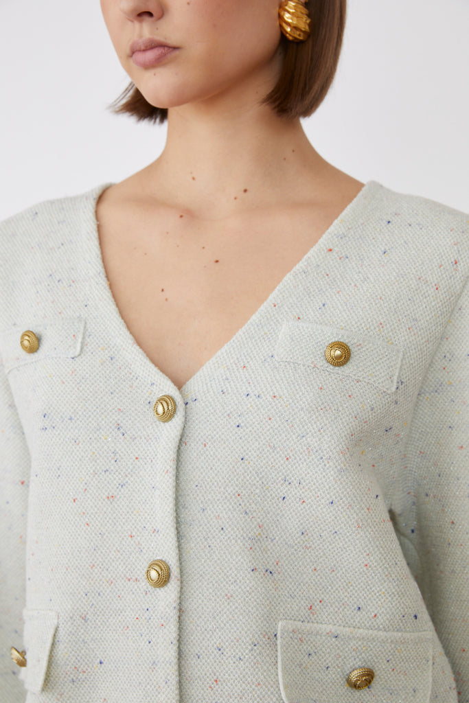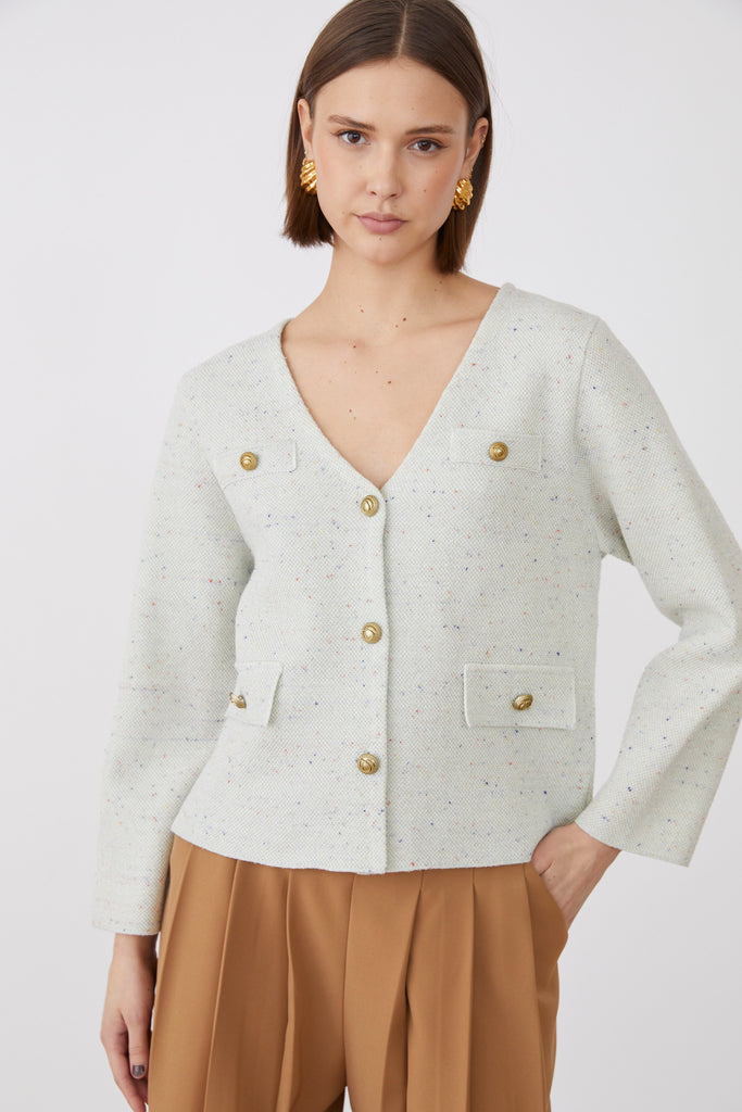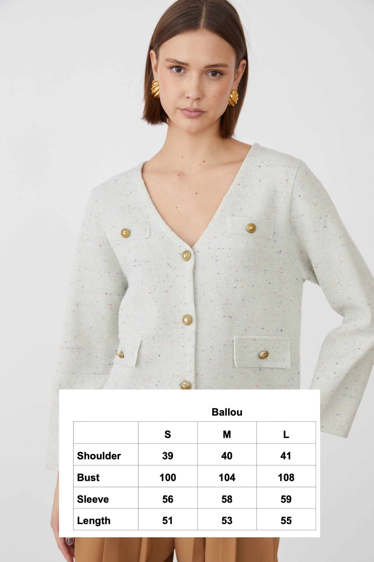 Elevate your wardrobe with the Ballou Jacket, featuring elegant gold buttons and a flattering V-neck design. Equipped with practical pockets, this jacket seamlessly combines refined style with everyday functionality, making it a timeless addition to any sophisticated ensemble.