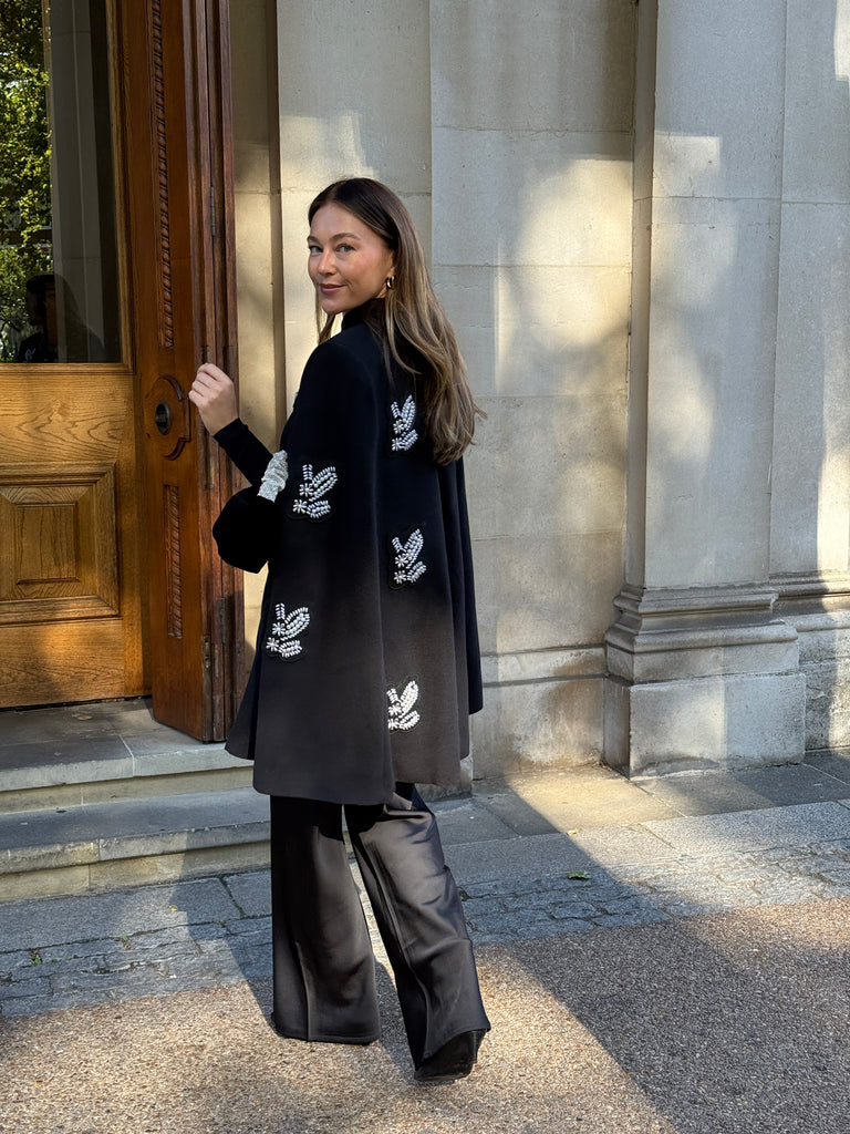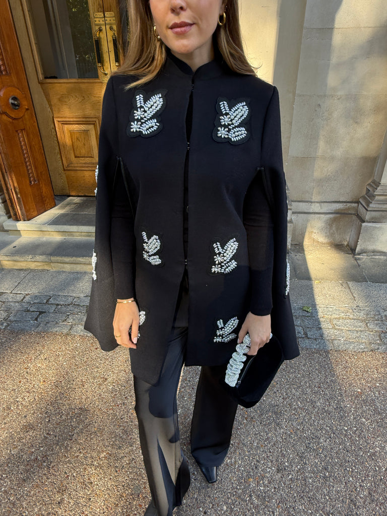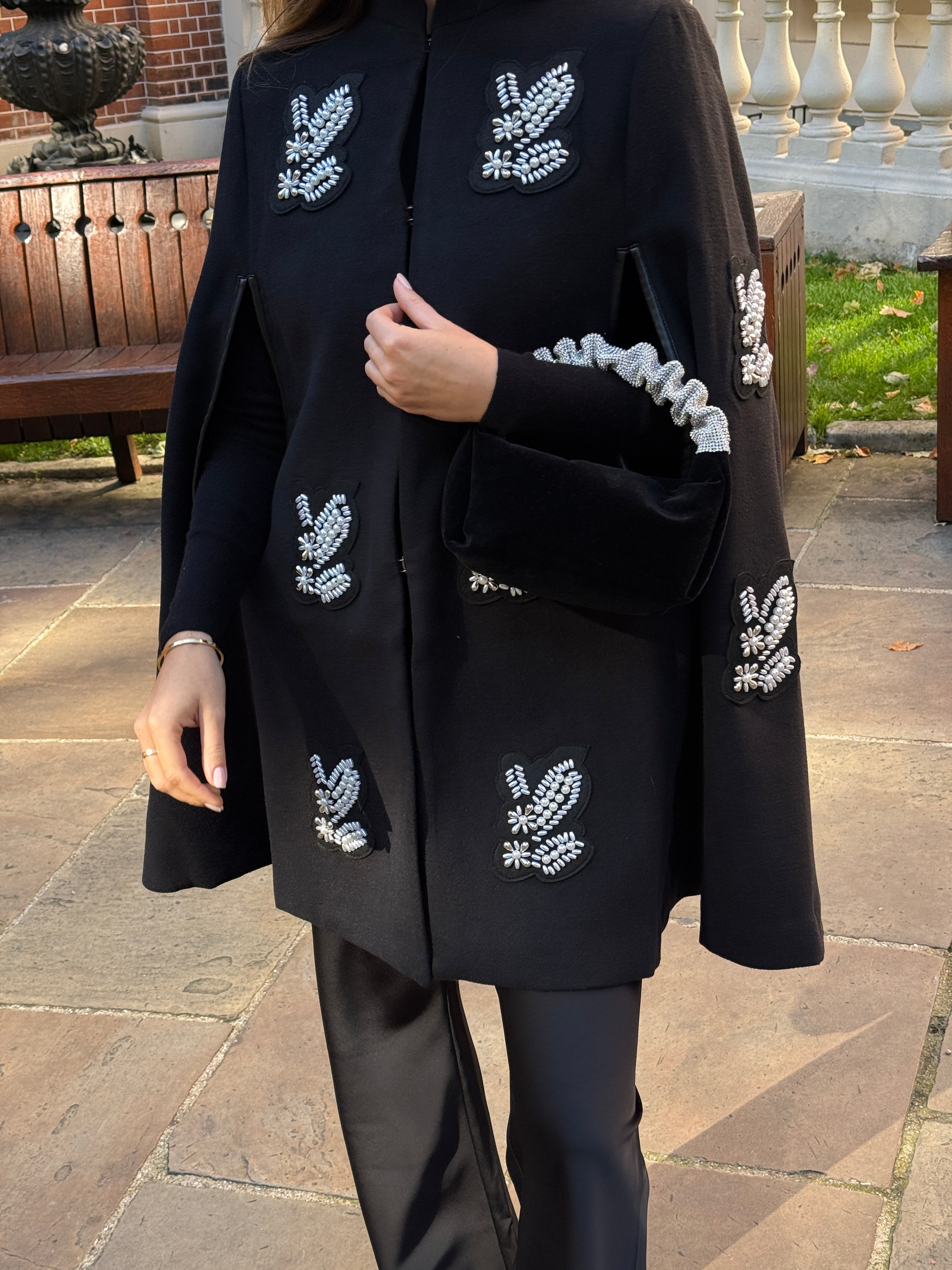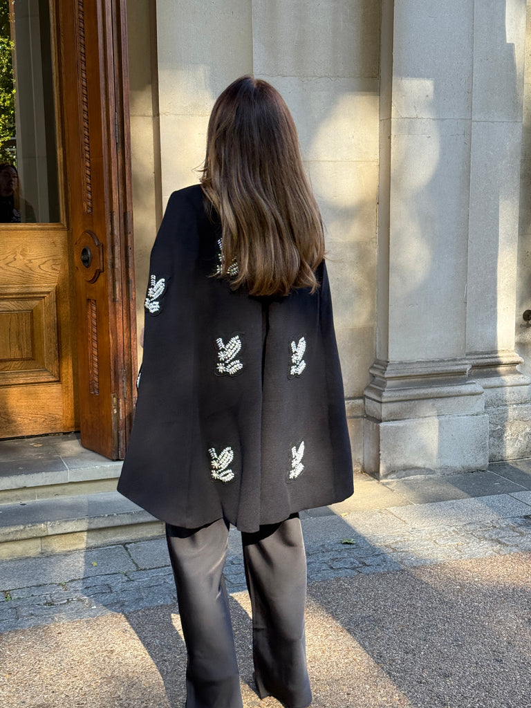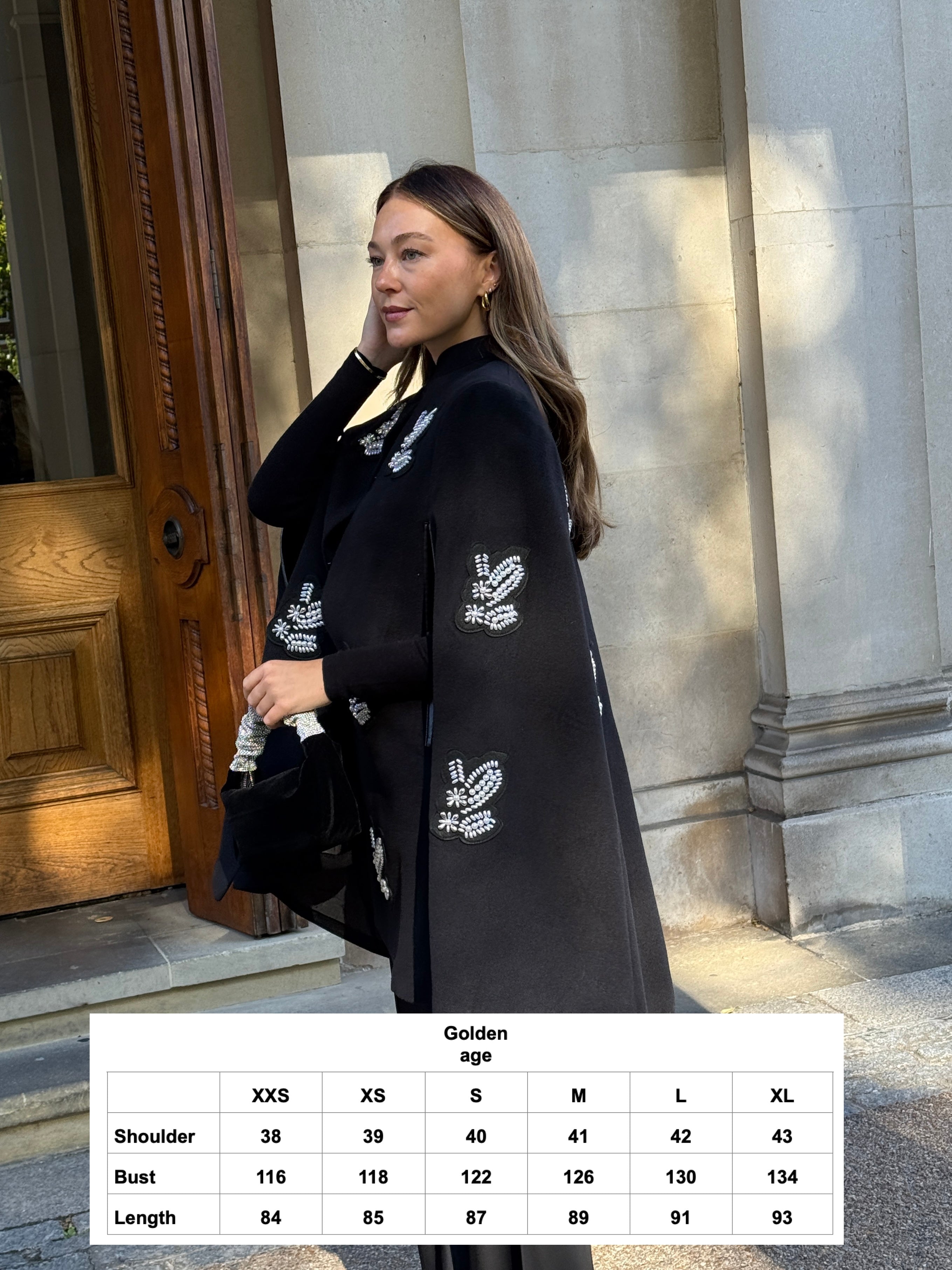 Elevate your ensemble with the Golden Age Cape, featuring exquisite pearl embellishments that add a touch of timeless elegance. This sophisticated piece is perfect for special events and seamlessly complements any outfit, making it a versatile addition to your wardrobe.