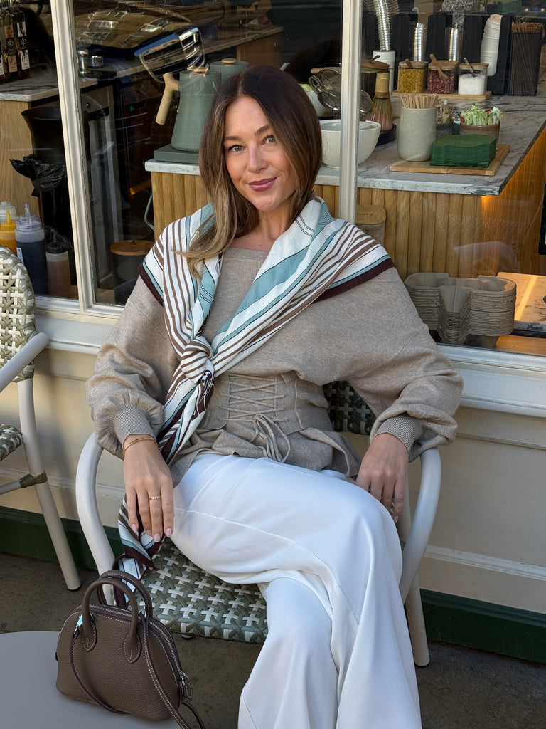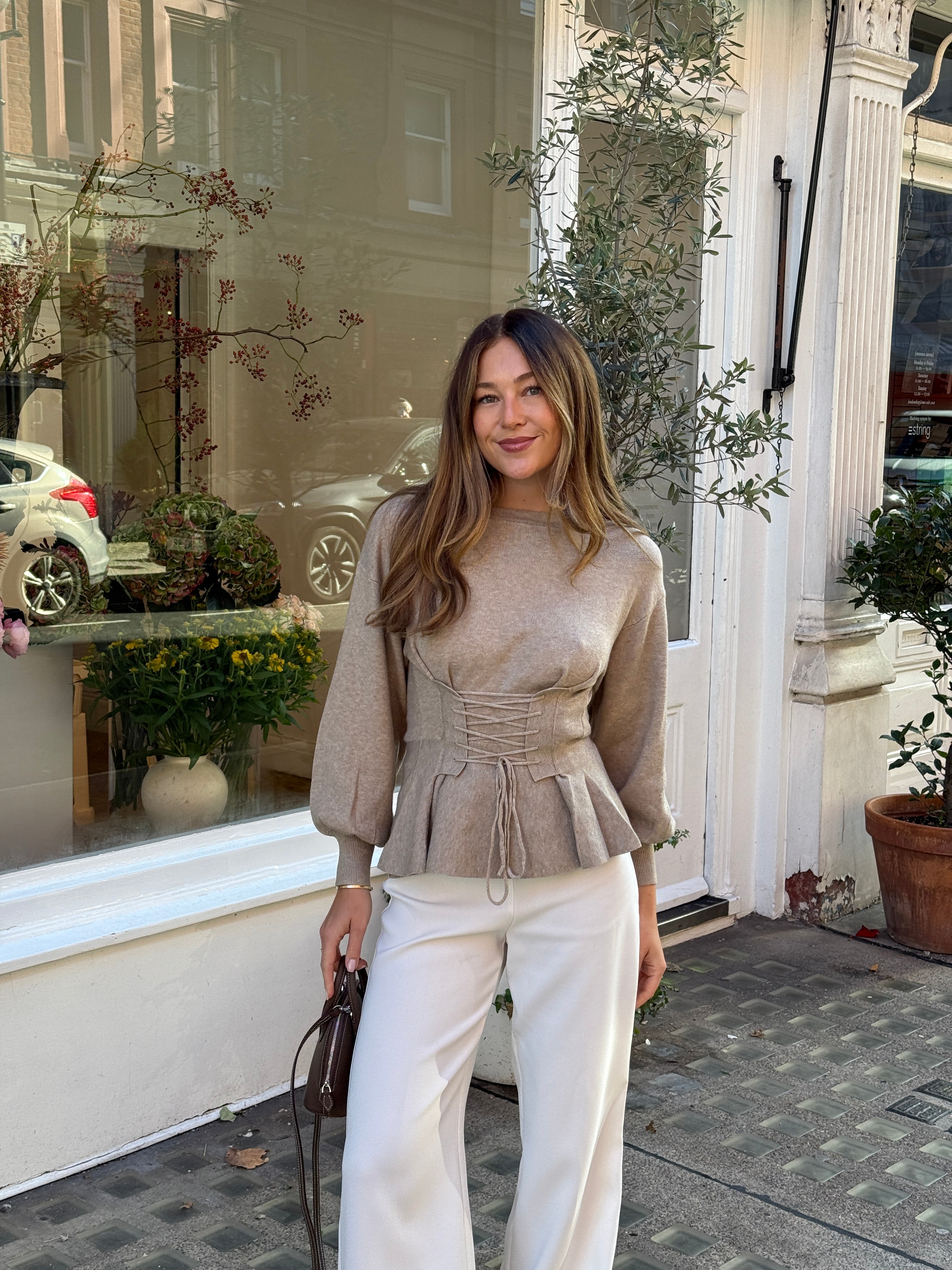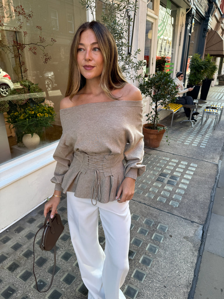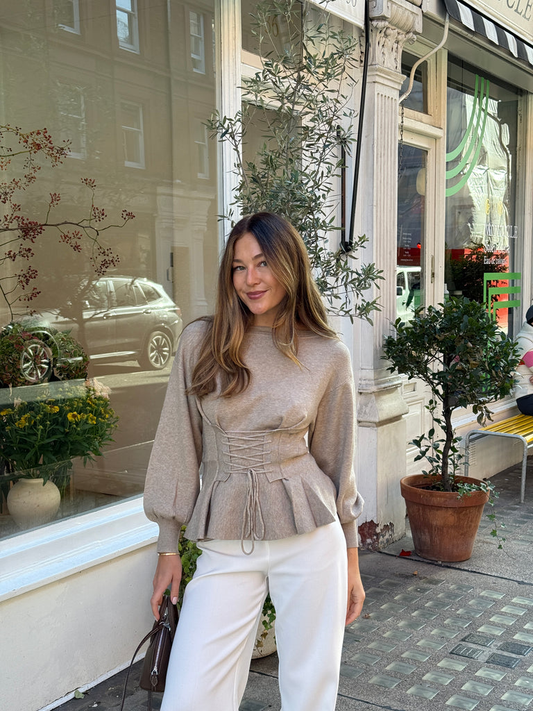 This elegant JEN Jumper in beige features a corset-style design that cinches beautifully at the waist, enhancing your silhouette with a refined touch. The off-the-shoulder neckline adds a sophisticated and feminine allure, it can also be worn at the neckline. Crafted to blend comfort with statement style, this jumper is a versatile addition to any wardrobe.