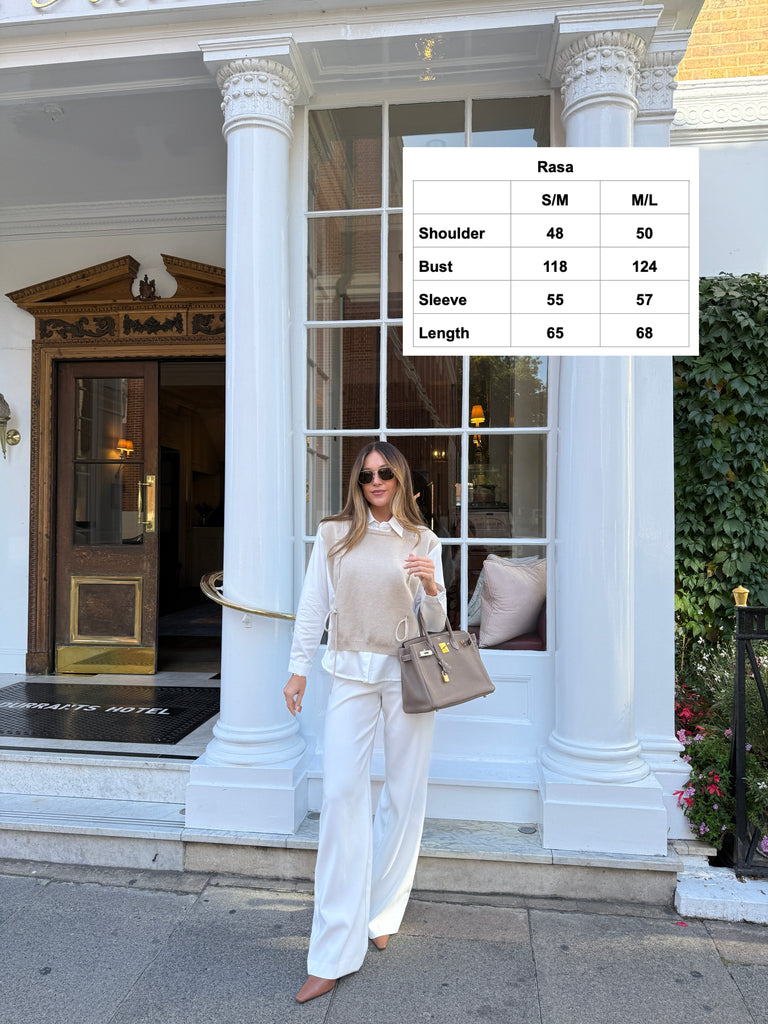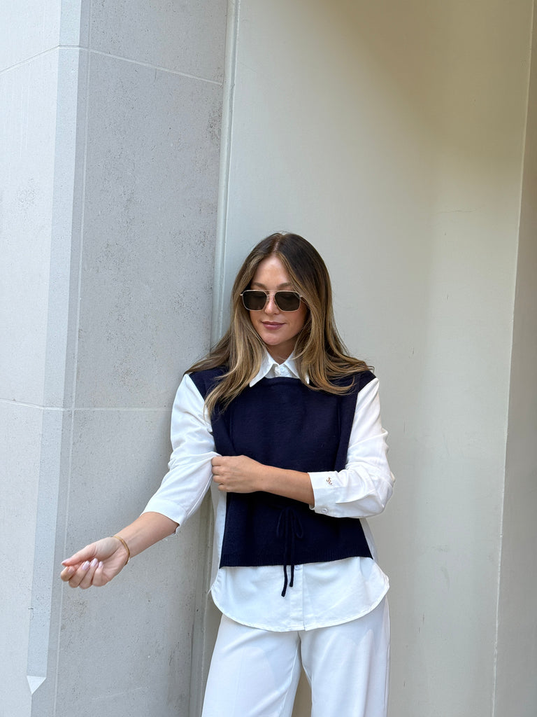 The RASA SHIRT navy epitomises refined simplicity. This ingeniously constructed piece fuses a soft knitted vest with a structured shirt layer, creating a singular garment that achieves both comfort and polish. The crisp integrated front elevates your silhouette with architectural precision, whilst the warm beige tone provides a versatile canvas for layering or standalone wear. An investment piece that transcends seasonal trends—the perfect foundational layer for a curated, sophisticated wardrobe.
