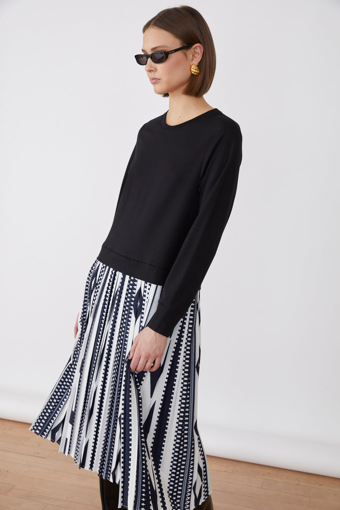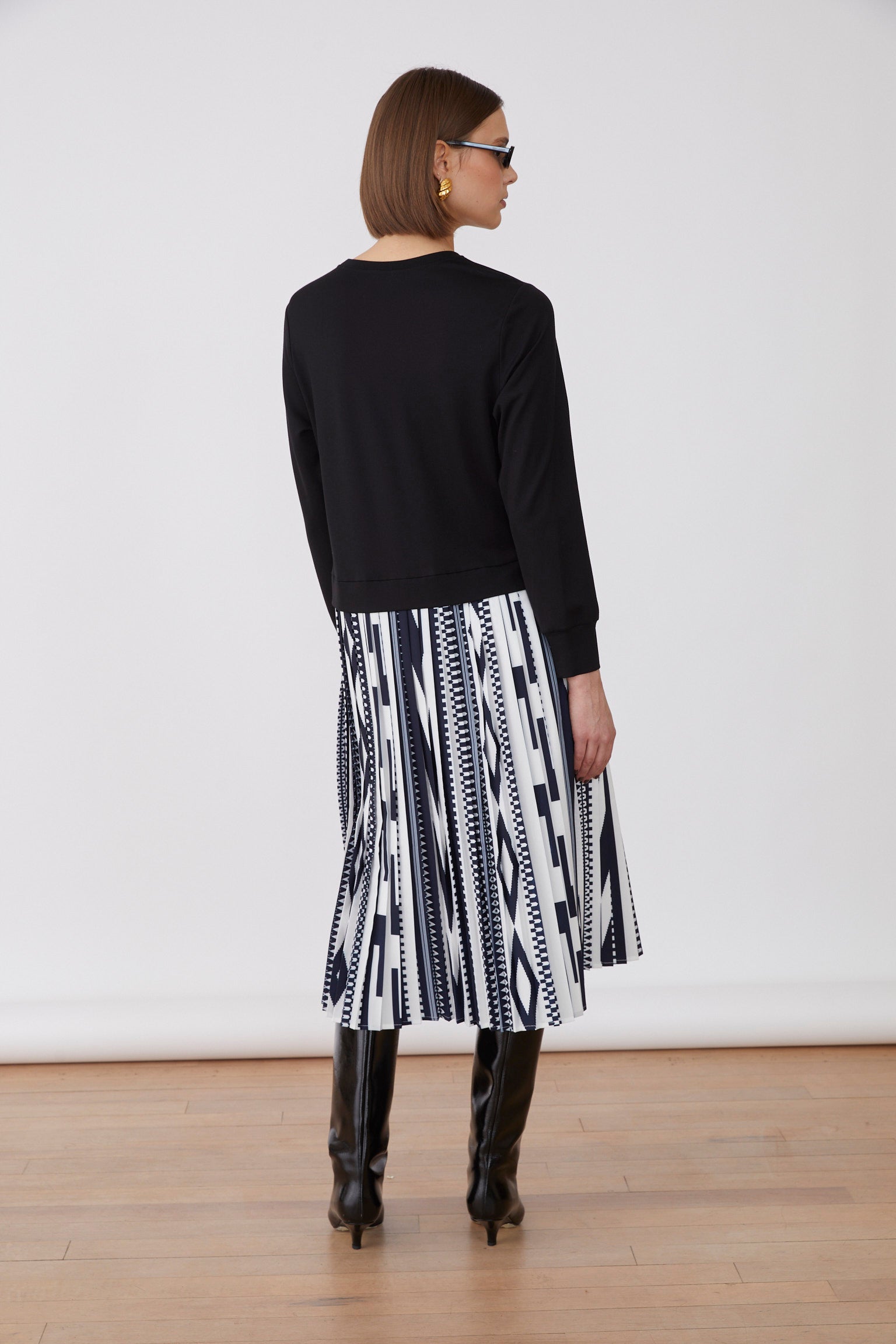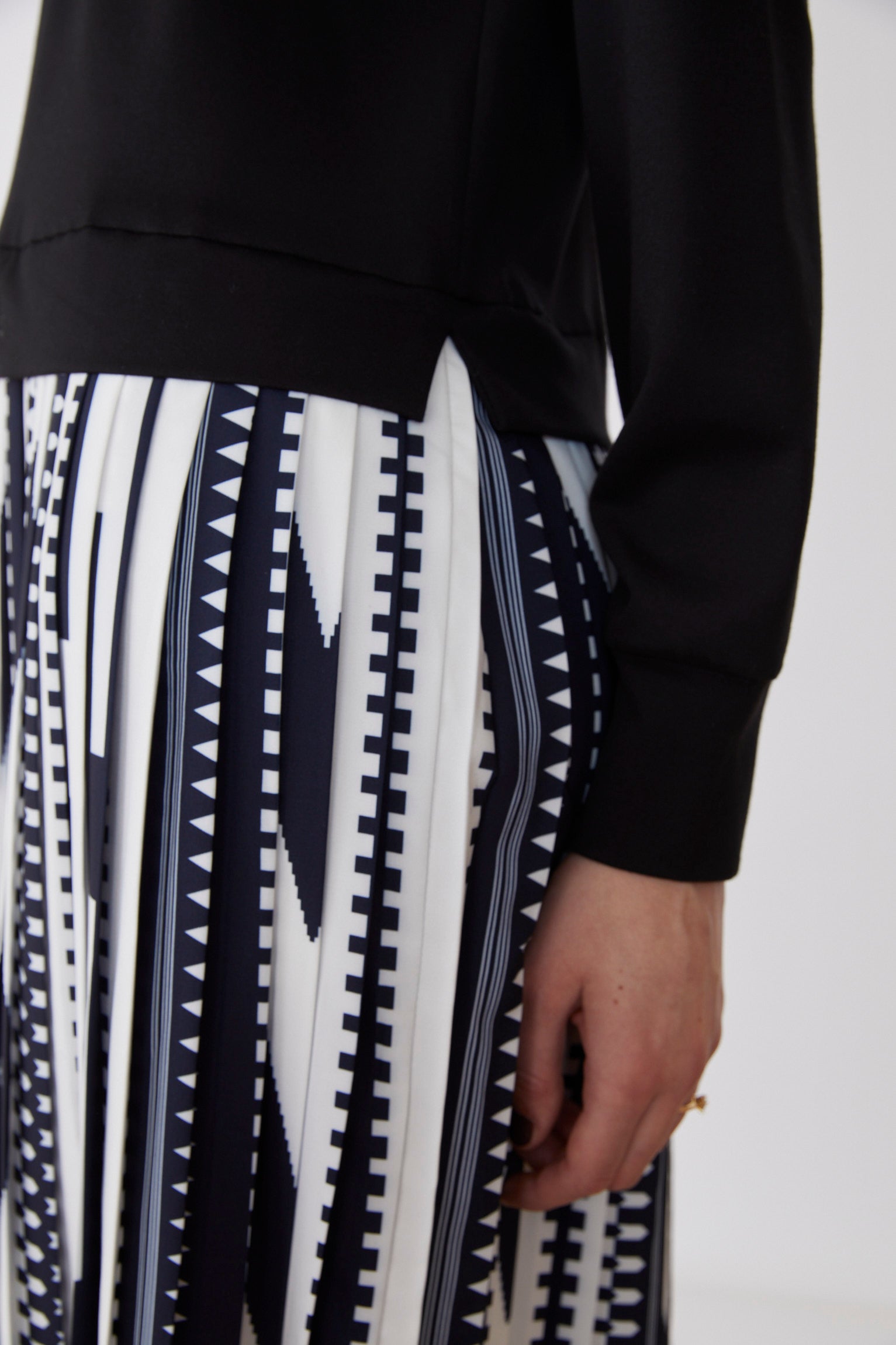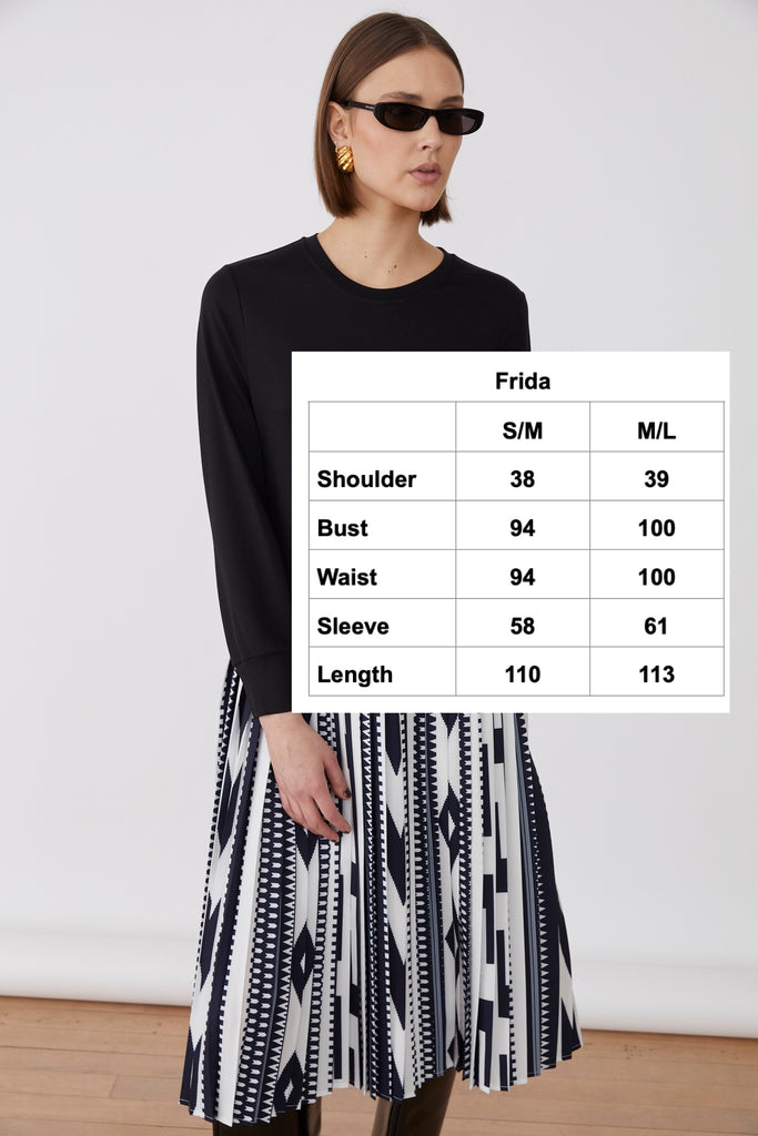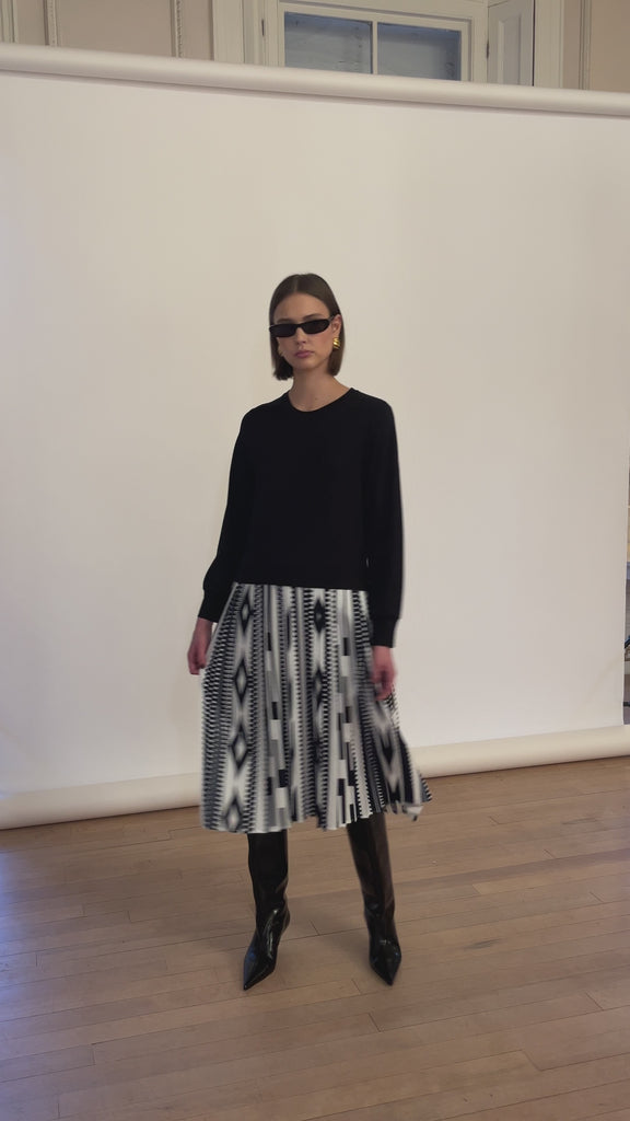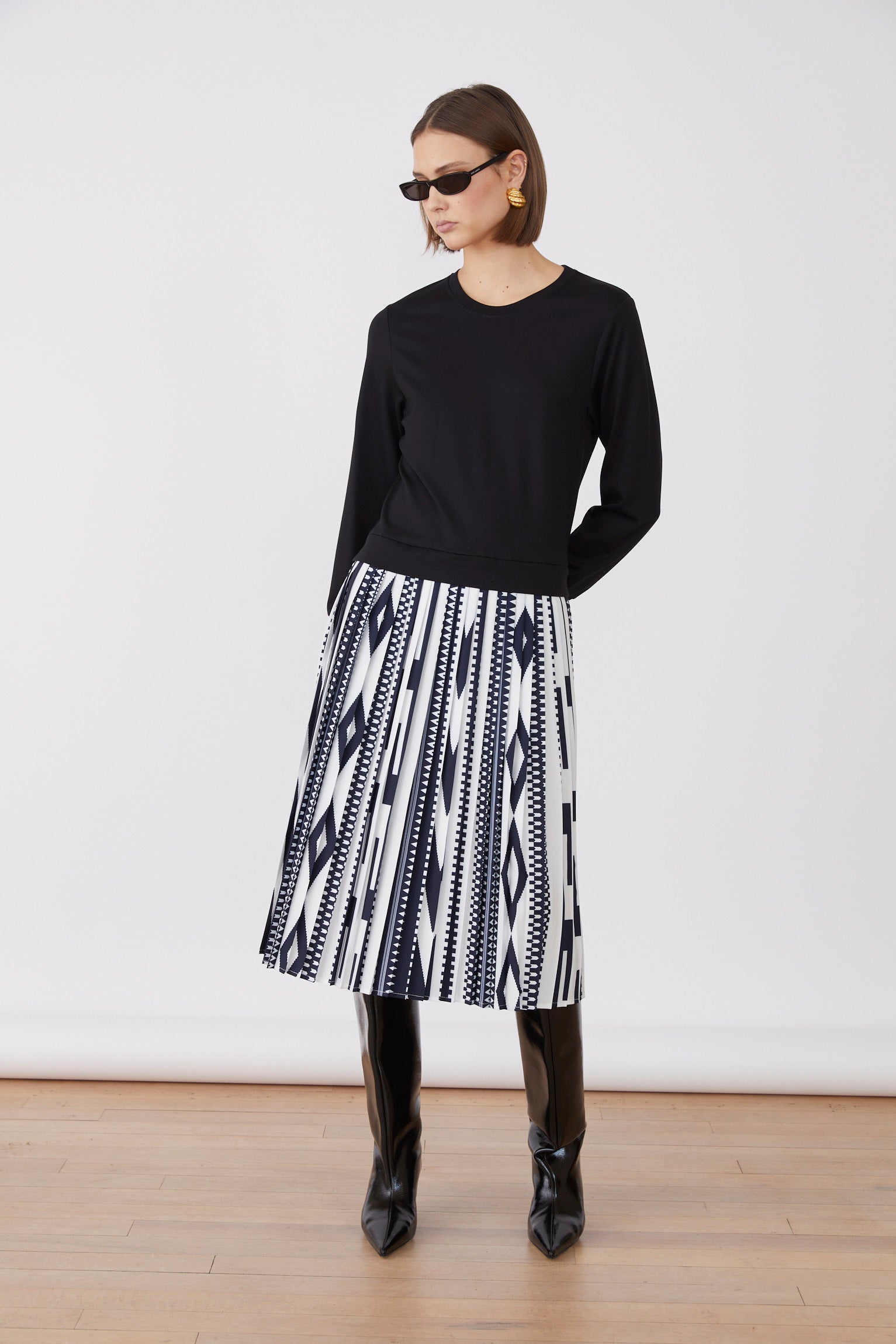 Elevate your wardrobe with the FRIDA Knitted Dress, featuring a refined long sleeve design that blends comfort and elegance. The contrasting pleated skirt showcases a striking geometric pattern, adding visual interest and movement to your silhouette. Perfect for sophisticated occasions, this dress balances classic knitwear with modern detailing for a polished, contemporary look.