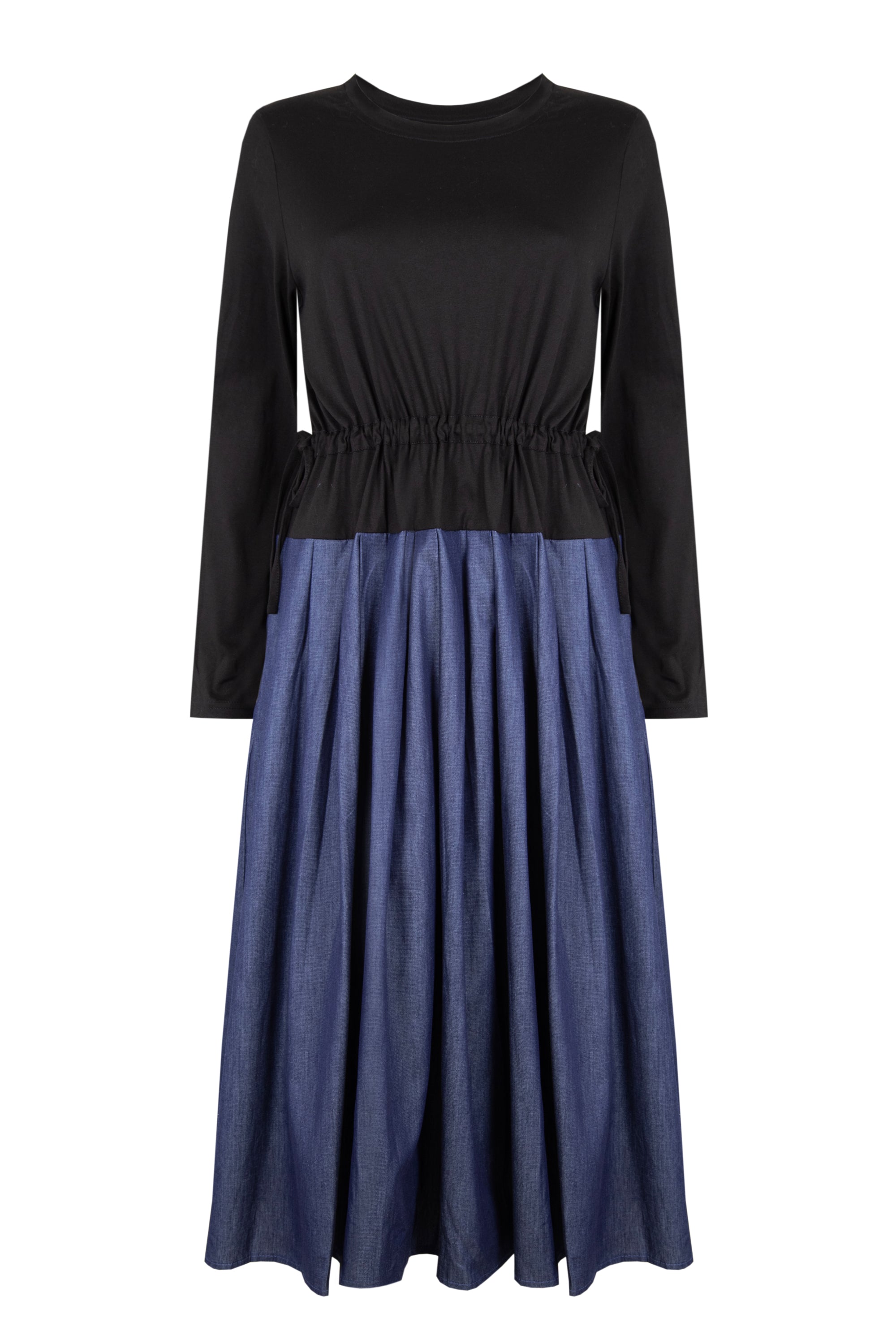Expertly crafted with a flattering tie waist and a versatile midi length, the HEATHER DRESS effortlessly combines comfort with style. Made with a denim skirt, this dress is sure to become a staple in your wardrobe. Its timeless design offers endless outfit possibilities.