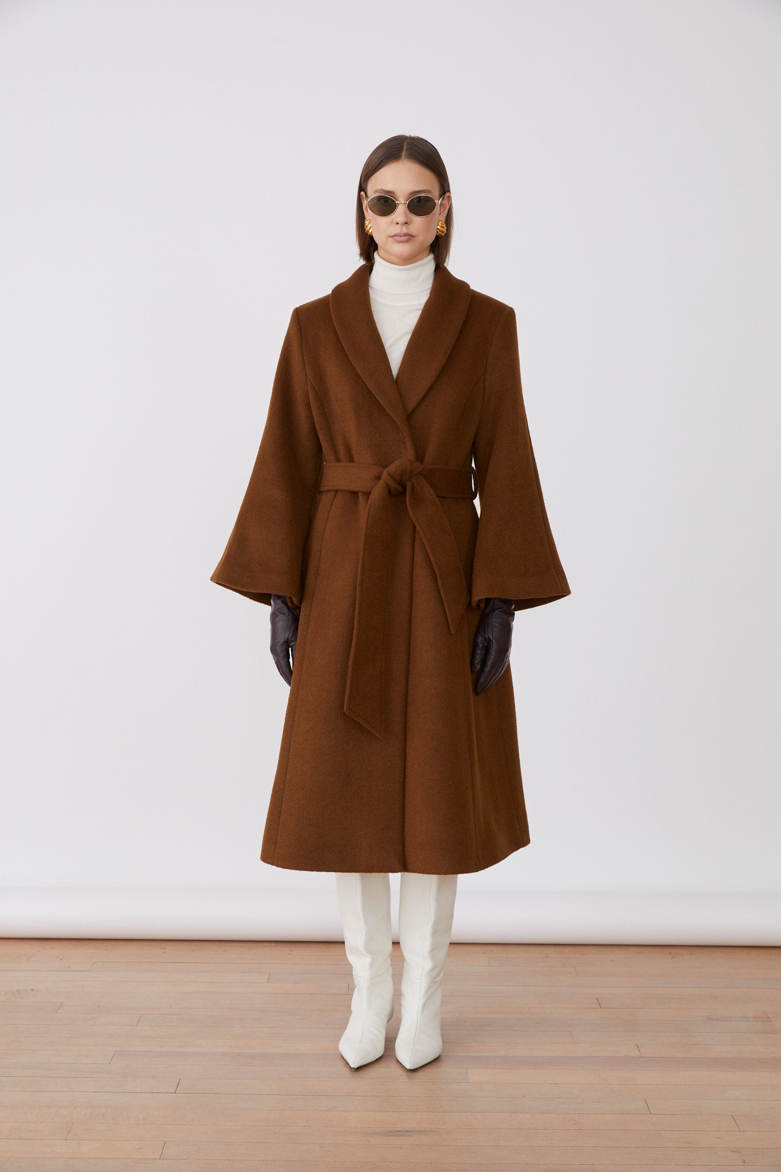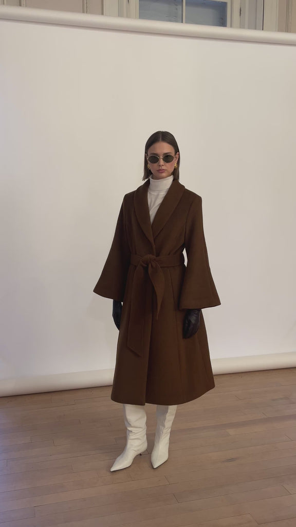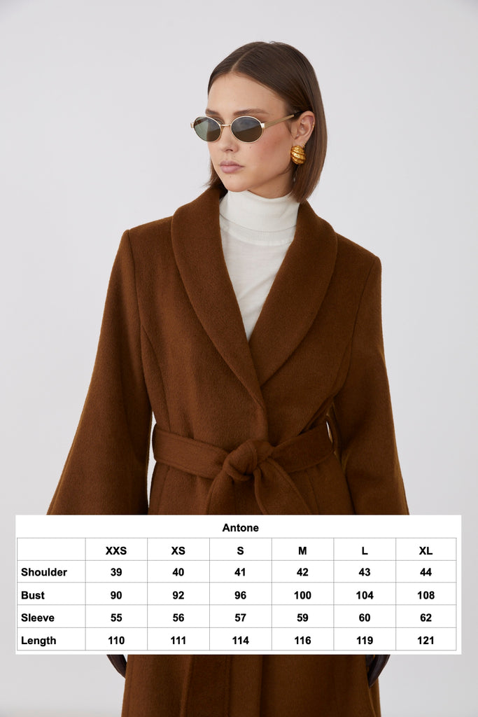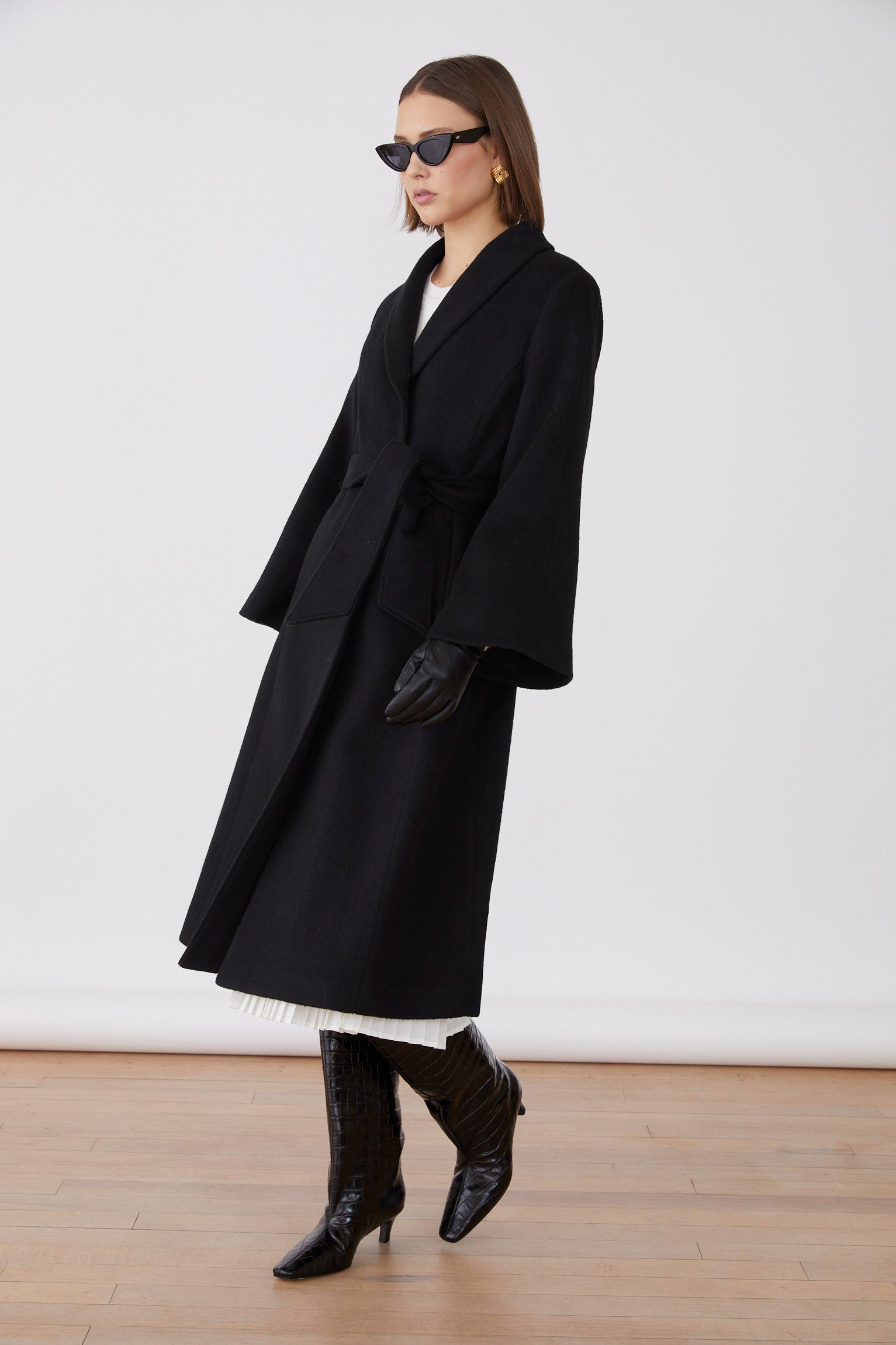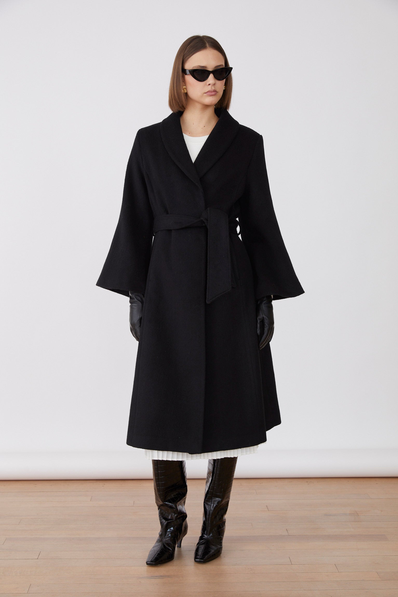 Crafted from 40% wool, the Antone Coat features elegant flared sleeves and a flattering V-neckline. Its long silhouette is cinched at the waist with a tie, enhancing a sophisticated shape while offering functional pockets for convenience. This coat combines classic refinement with modern details for a timeless, polished look.