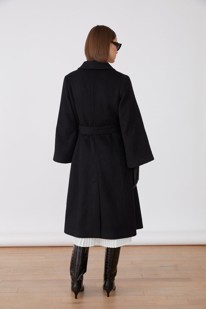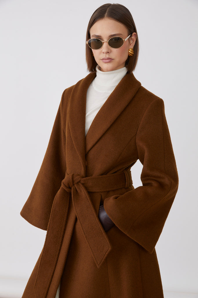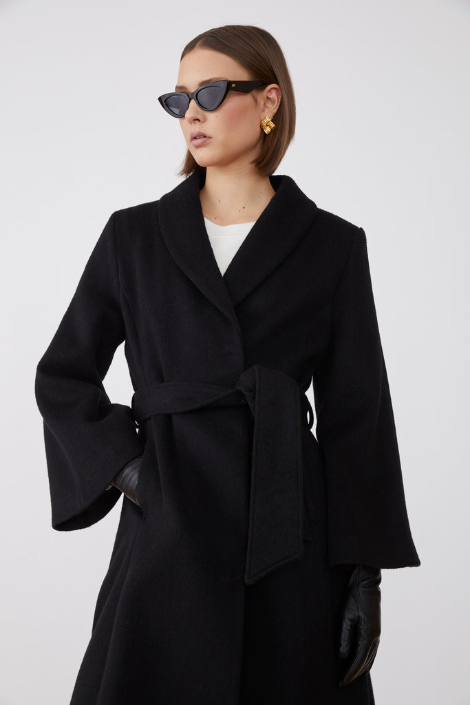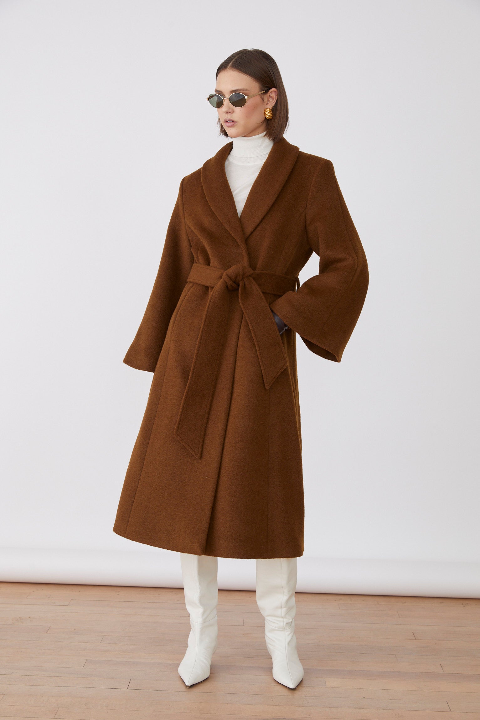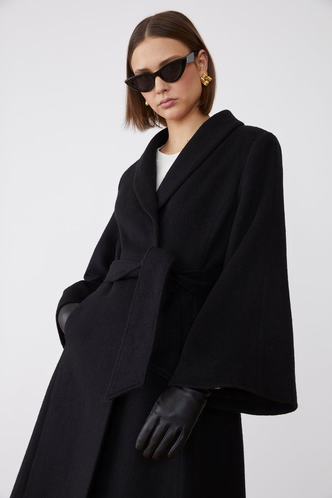Crafted from 40% wool, the Antone Coat features elegant flared sleeves and a flattering V-neckline. Its long silhouette is cinched at the waist with a tie, enhancing a sophisticated shape while offering functional pockets for convenience. This coat combines classic refinement with modern details for a timeless, polished look.