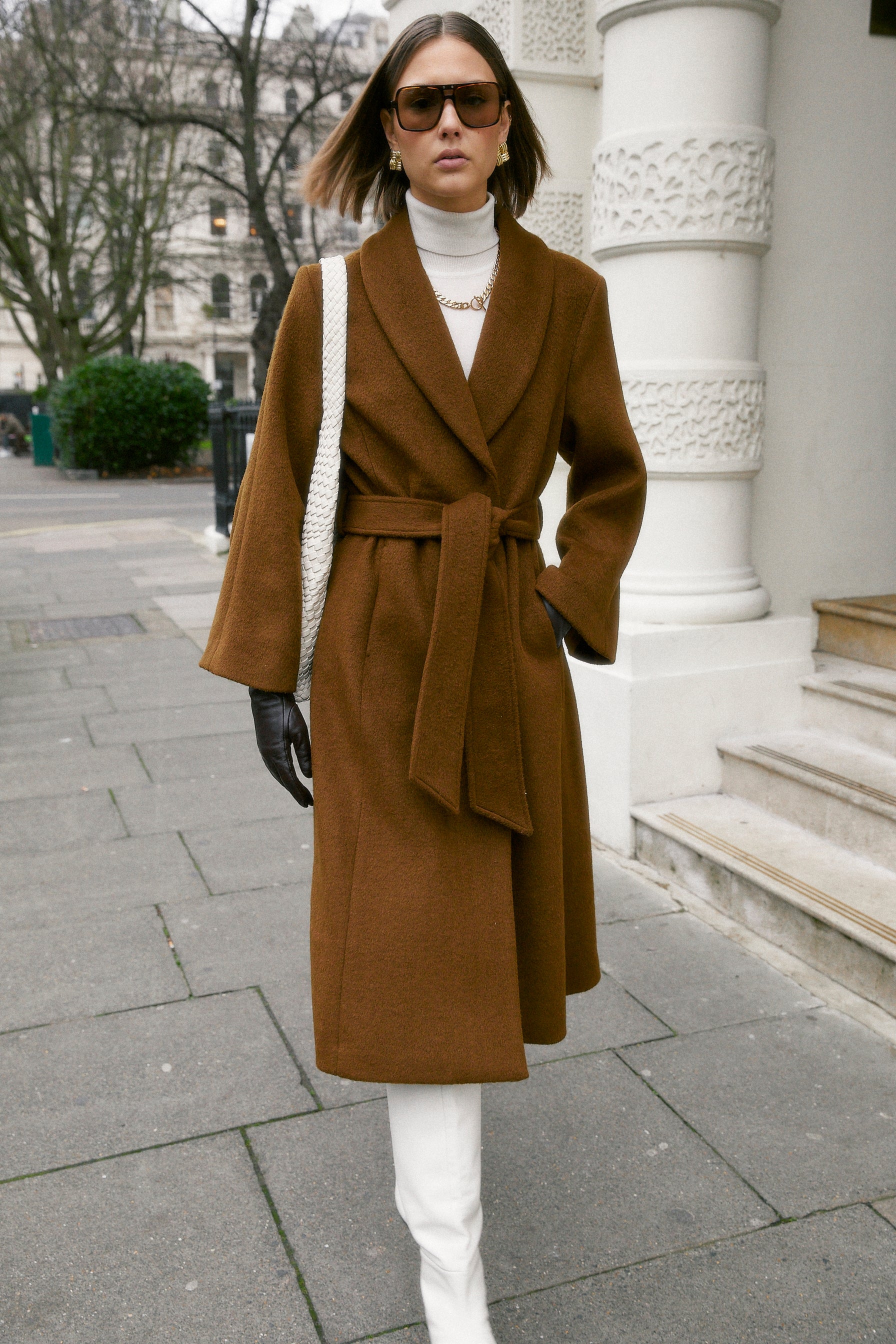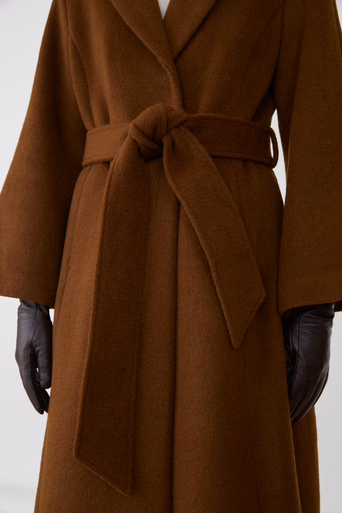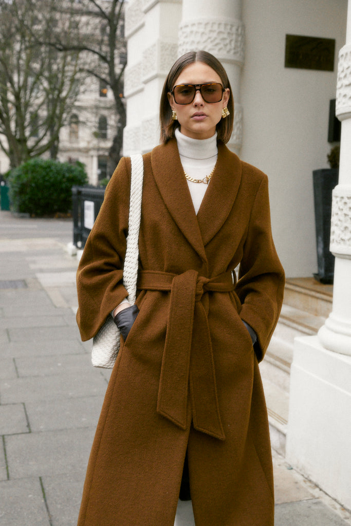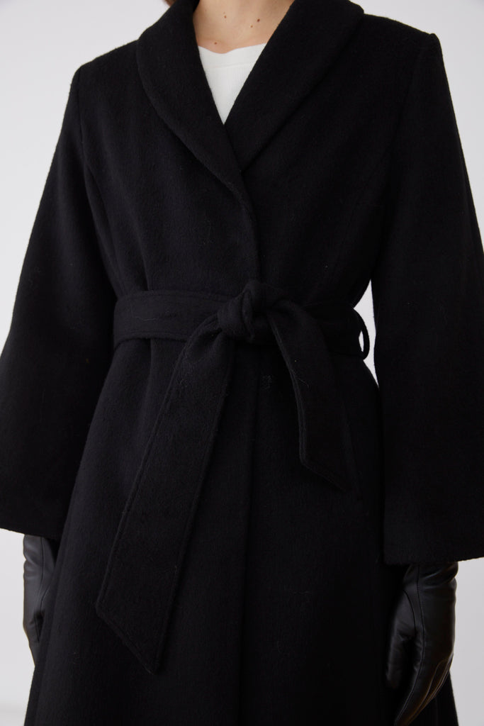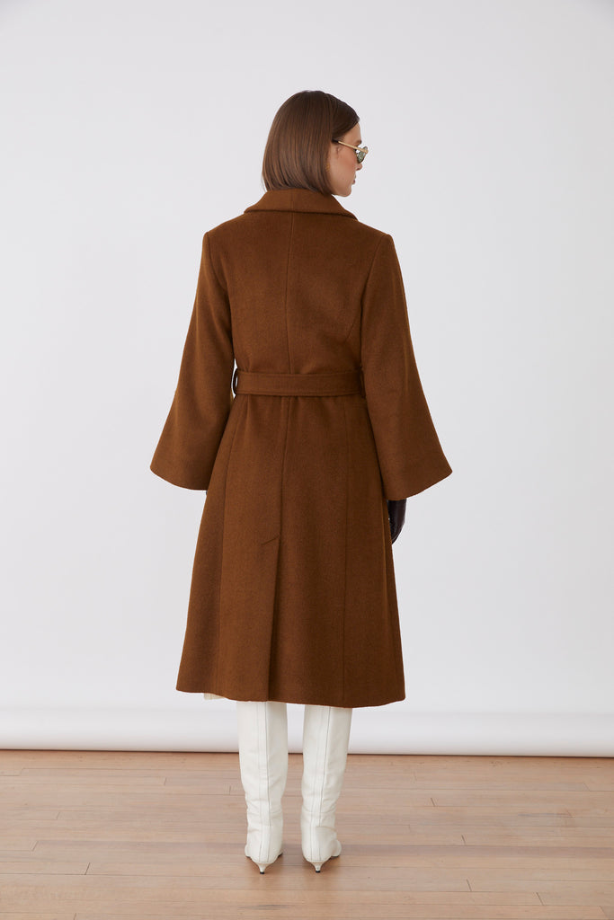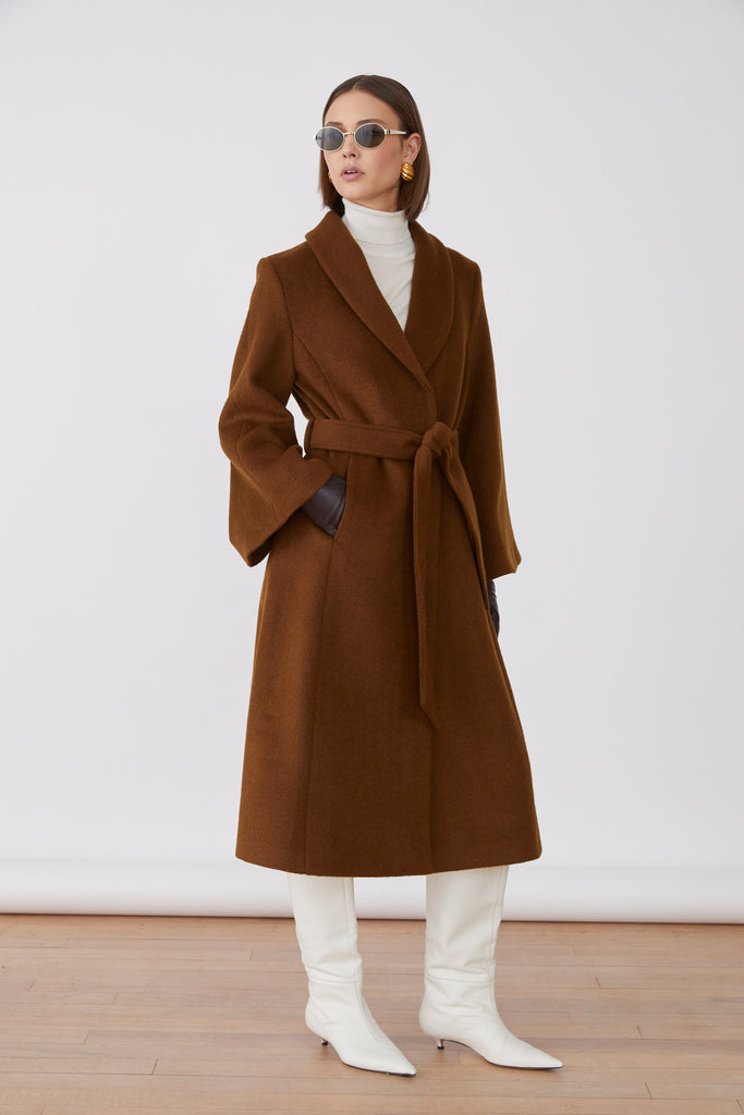 Crafted from 40% wool, the Antone Coat features elegant flared sleeves and a flattering V-neckline. Its long silhouette is cinched at the waist with a tie, enhancing a sophisticated shape while offering functional pockets for convenience. This coat combines classic refinement with modern details for a timeless, polished look.