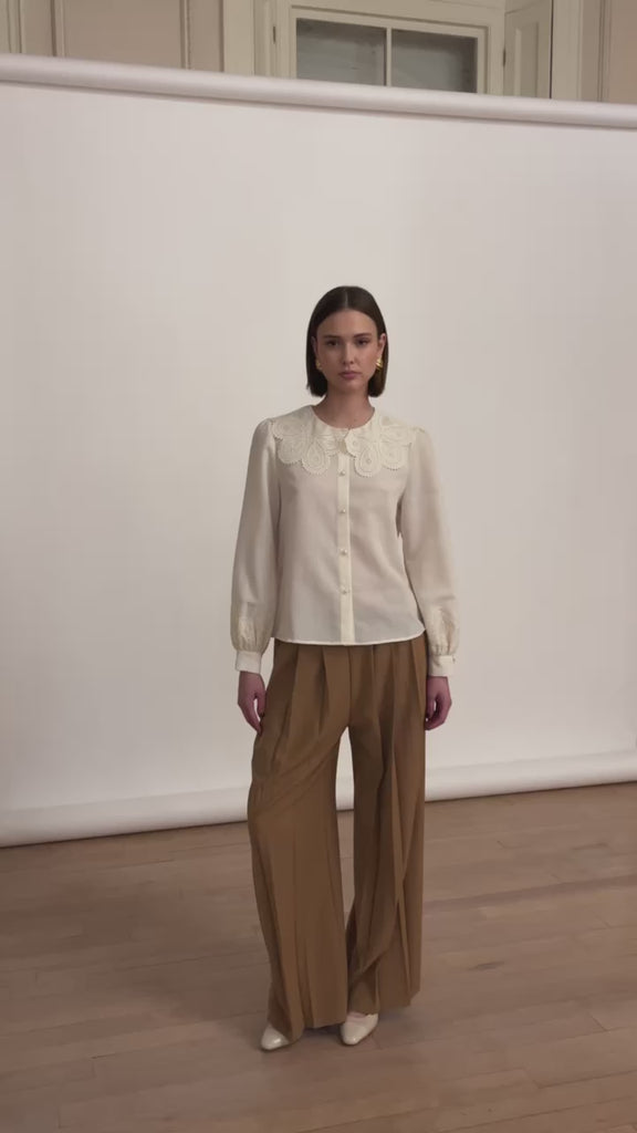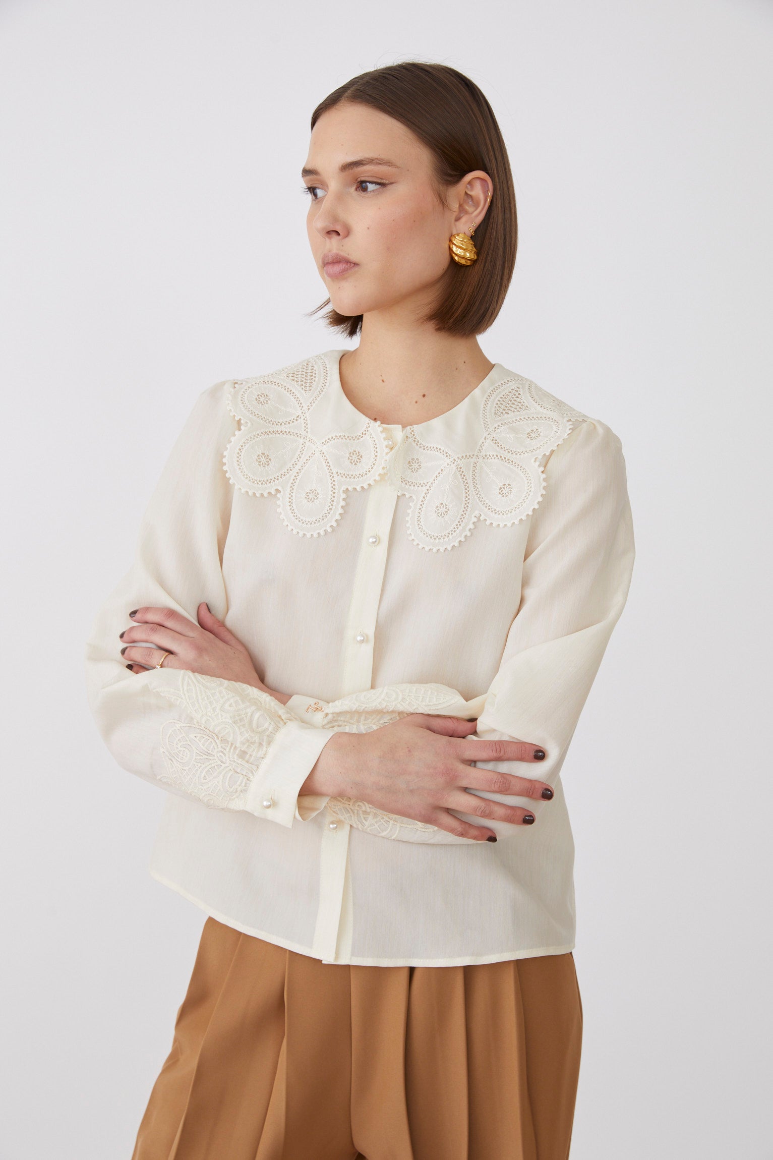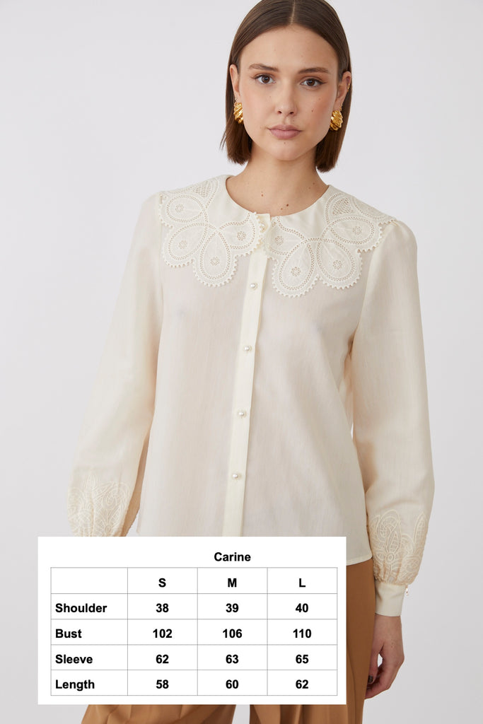 The CARINE BLOUSE features exquisite delicate embroidery around the collar and cuffs, adding a refined touch to its design. Pearl buttons enhance its elegance, making it a sophisticated choice for a polished and timeless look.
