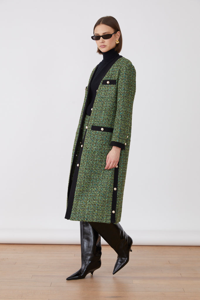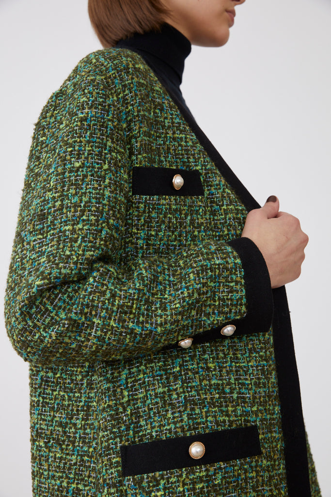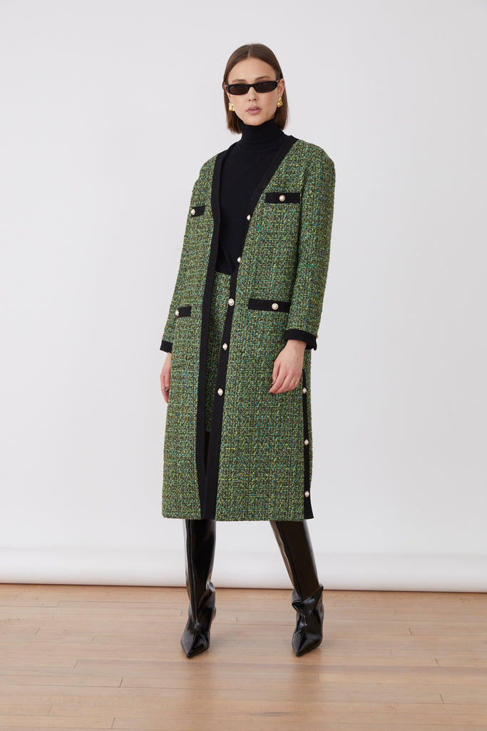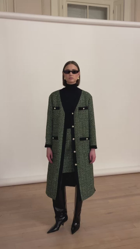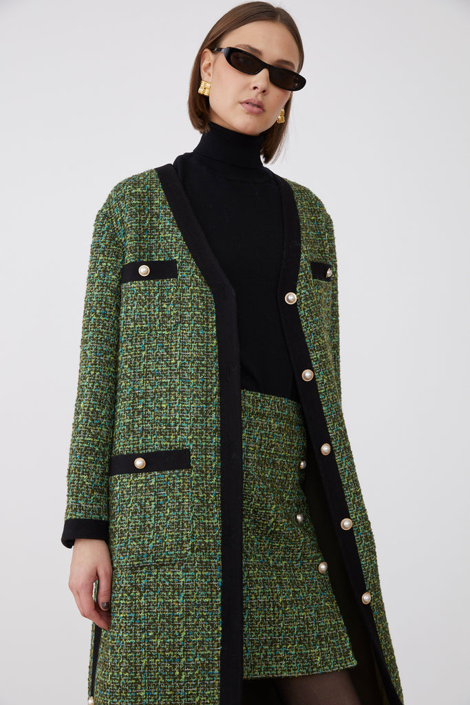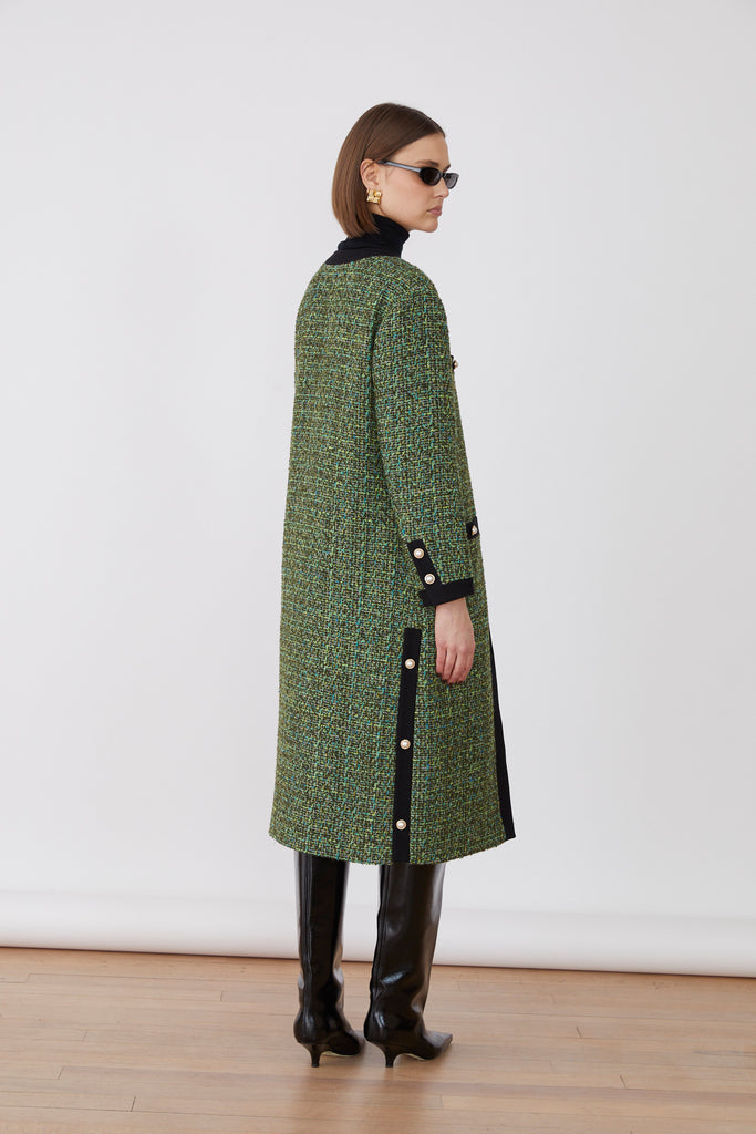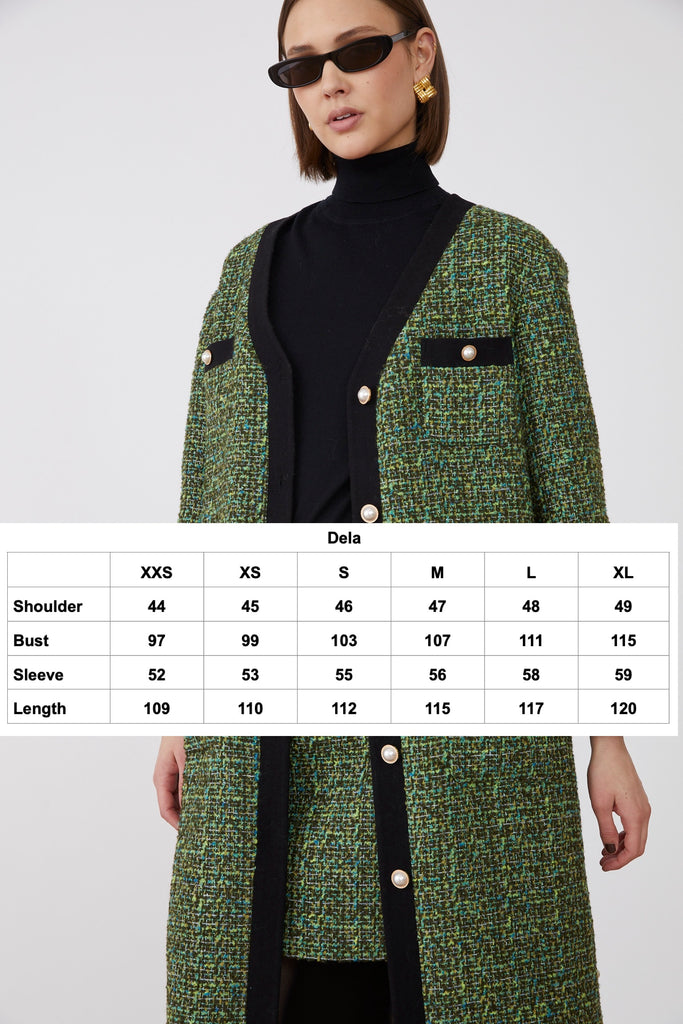 Elevate your wardrobe with the DELA COAT, a long green tweed-style jacket that blends timeless elegance with modern detailing. Featuring pearl buttons delicately set against contrasting black outlining, this coat offers refined sophistication and a striking visual contrast that enhances your silhouette. Perfect for adding a polished touch to any ensemble, the DELA COAT is a versatile piece designed to impress.