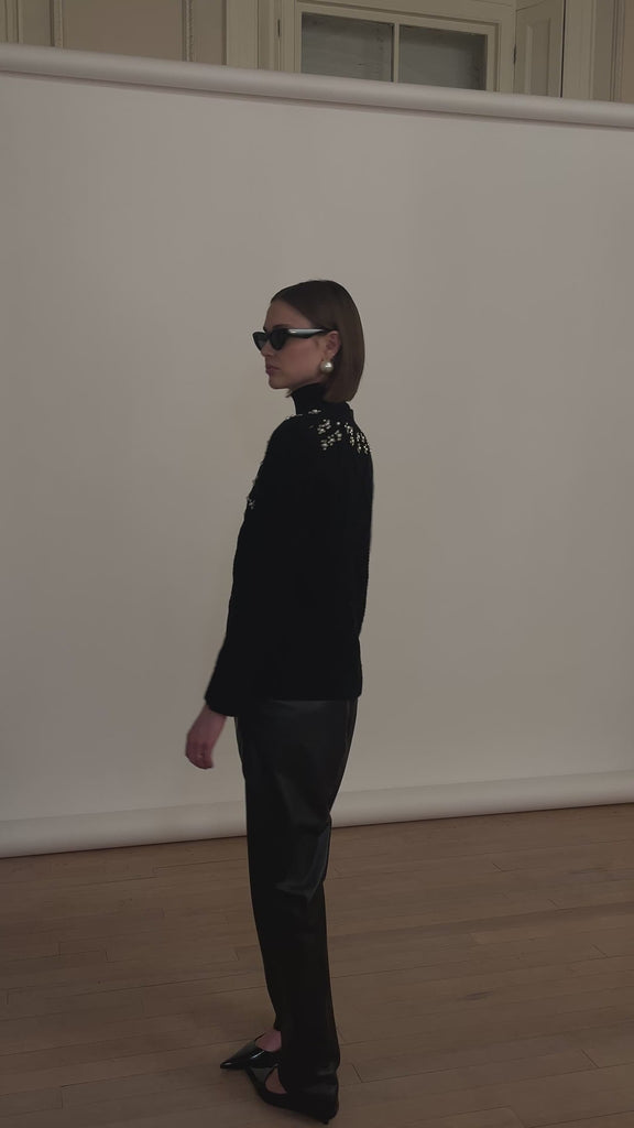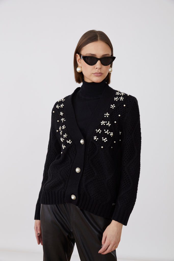 Elevate your wardrobe with the Gelso Cardigan black, featuring elegant pearl details that add a refined touch. The cardigan is adorned with exquisite pearl buttons, perfectly blending classic sophistication with modern style. Its creamy hue complements any outfit, making it an essential piece for a polished look.