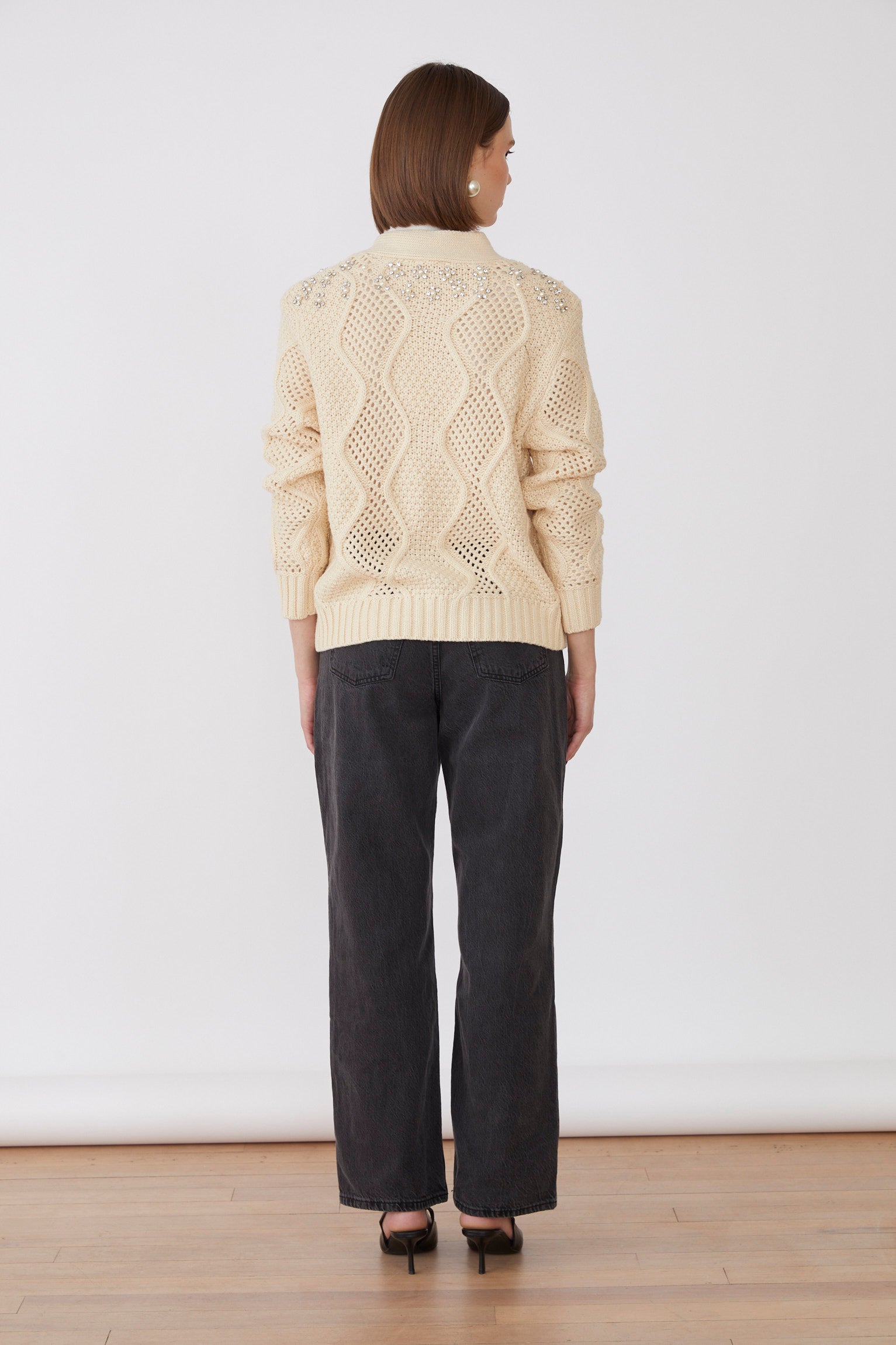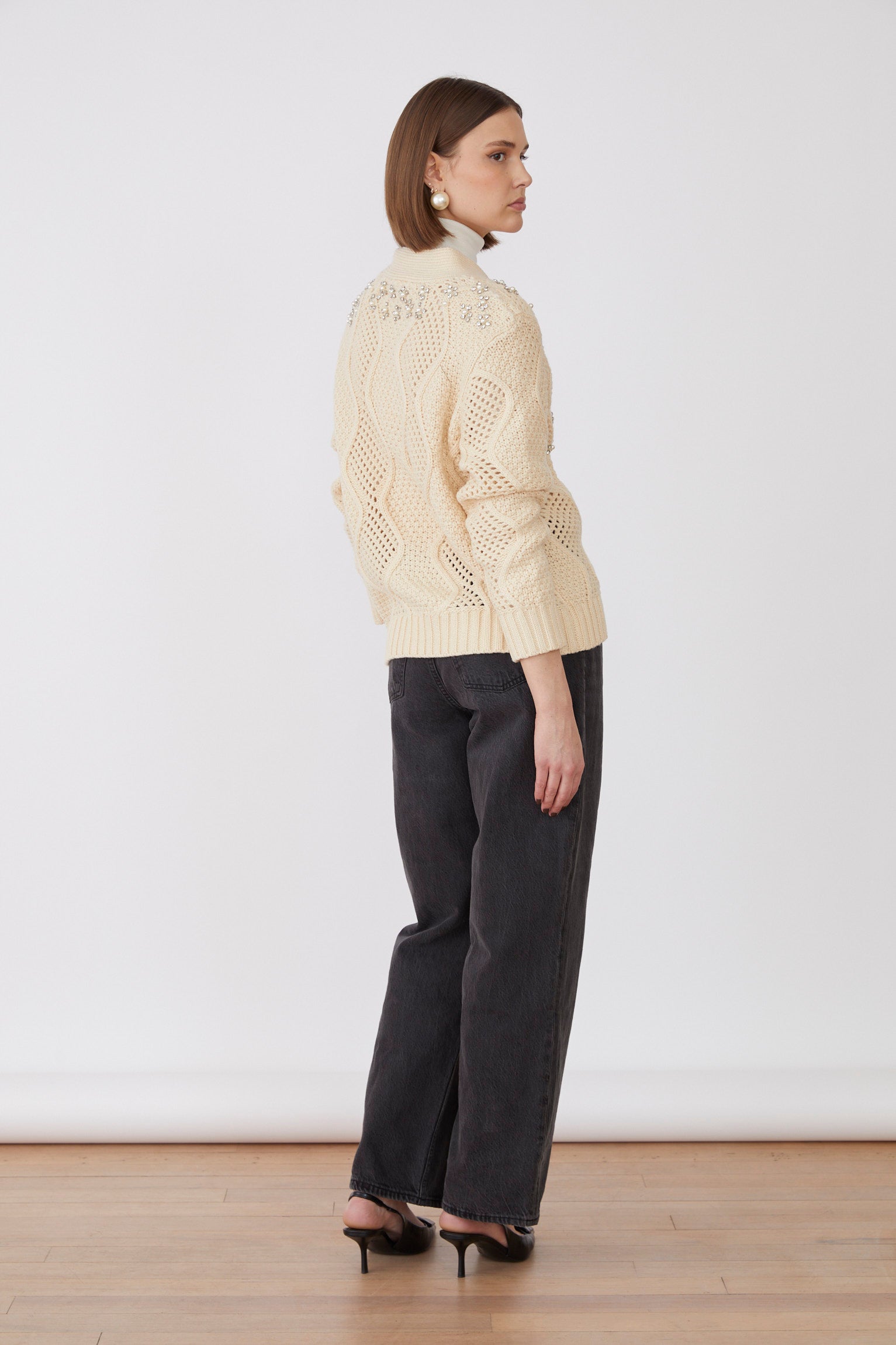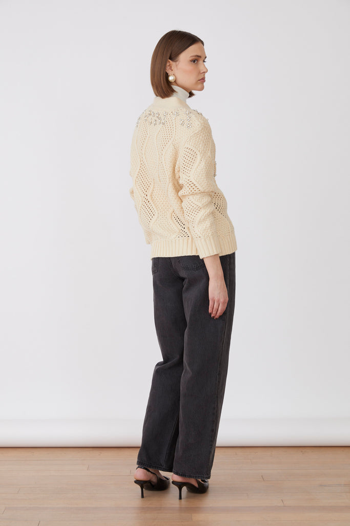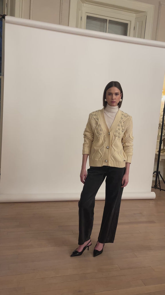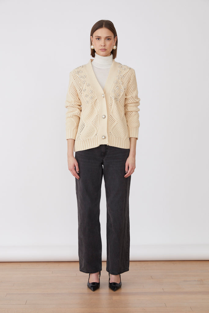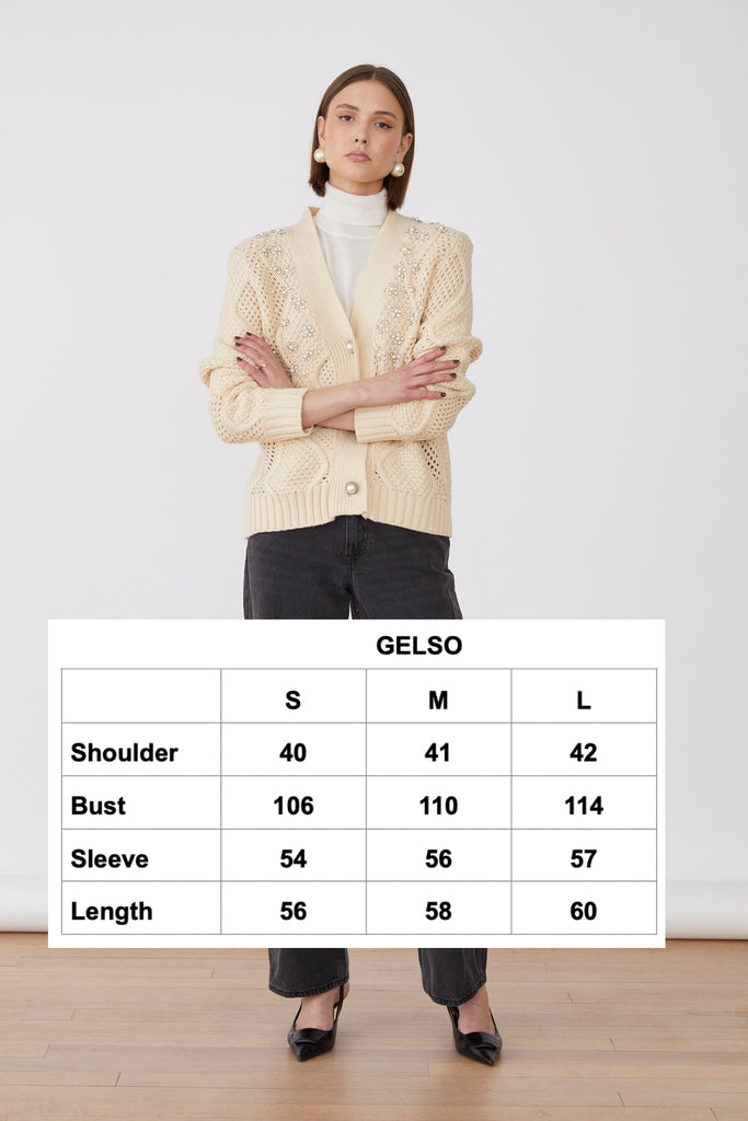 Elevate your wardrobe with the Gelso Cardigan Cream, featuring elegant pearl details that add a refined touch. The cardigan is adorned with exquisite pearl buttons, perfectly blending classic sophistication with modern style. Its creamy hue complements any outfit, making it an essential piece for a polished look.