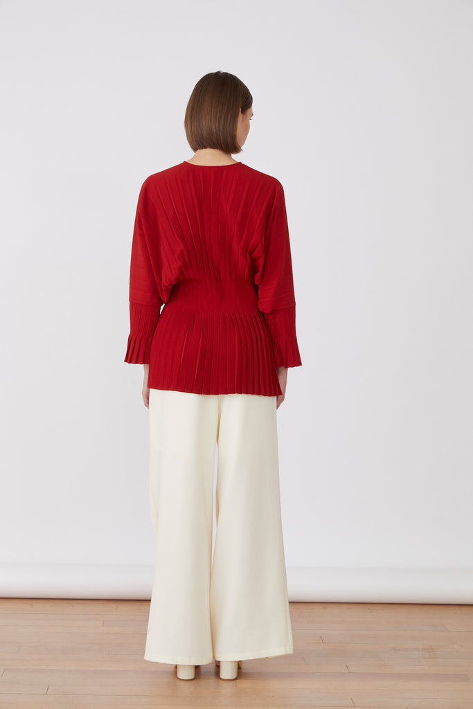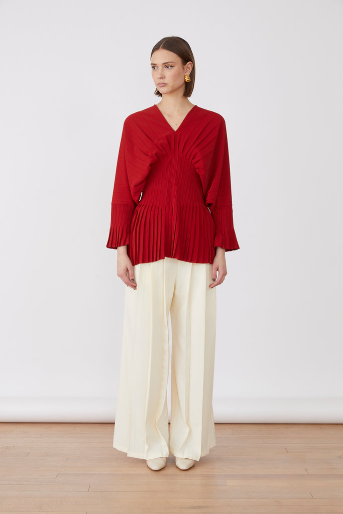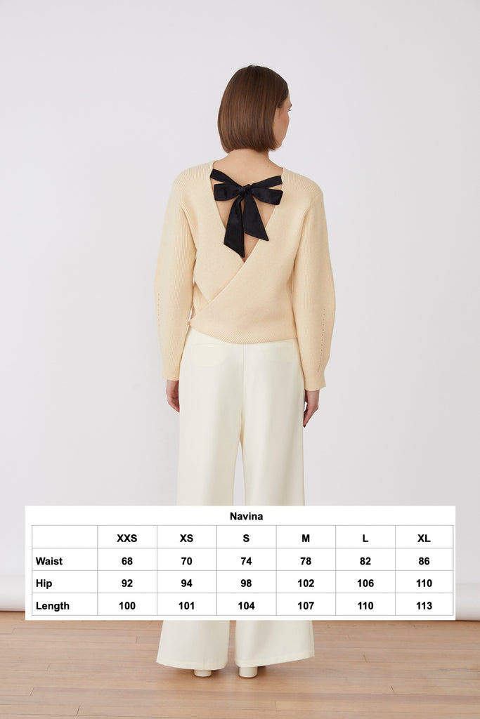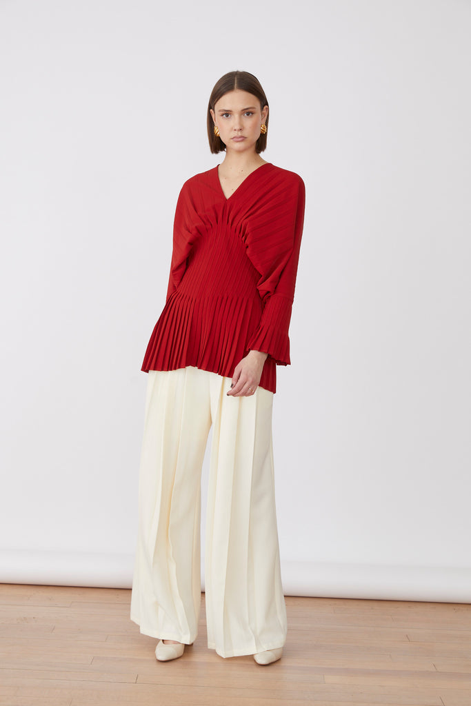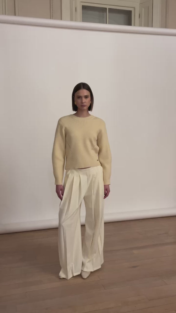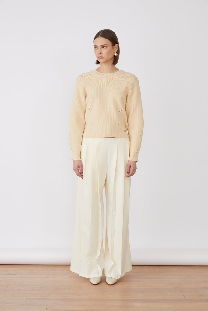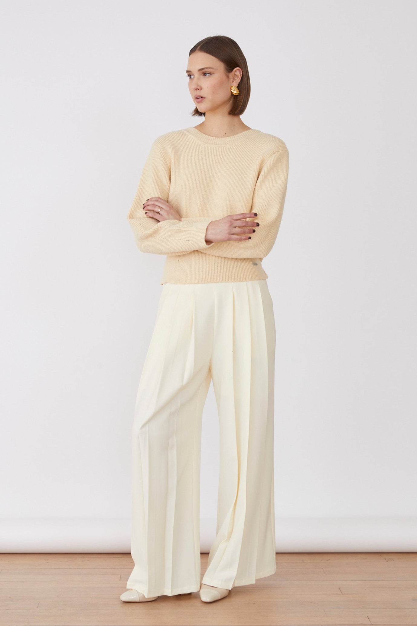 The Navina Trousers in Cream feature a sophisticated pleated design with wide legs that offer a graceful silhouette. Crafted from lightweight fabric, they provide a flowing, effortless drape, perfect for elegant, comfortable wear throughout the day.
