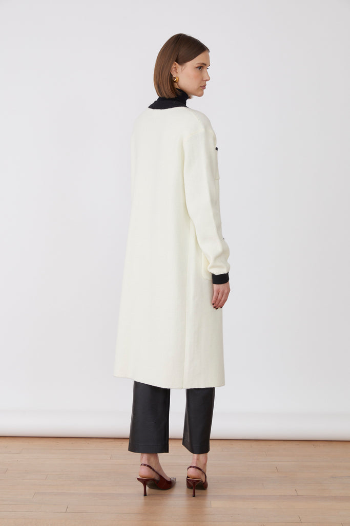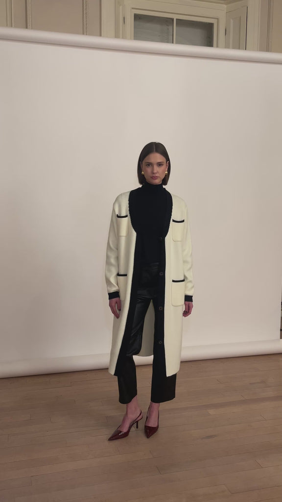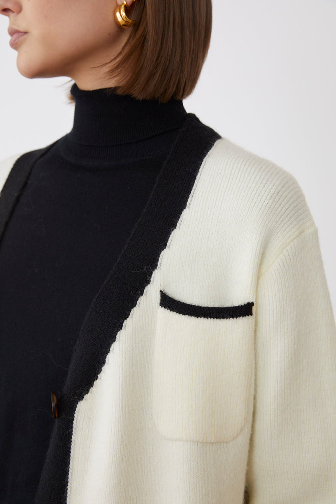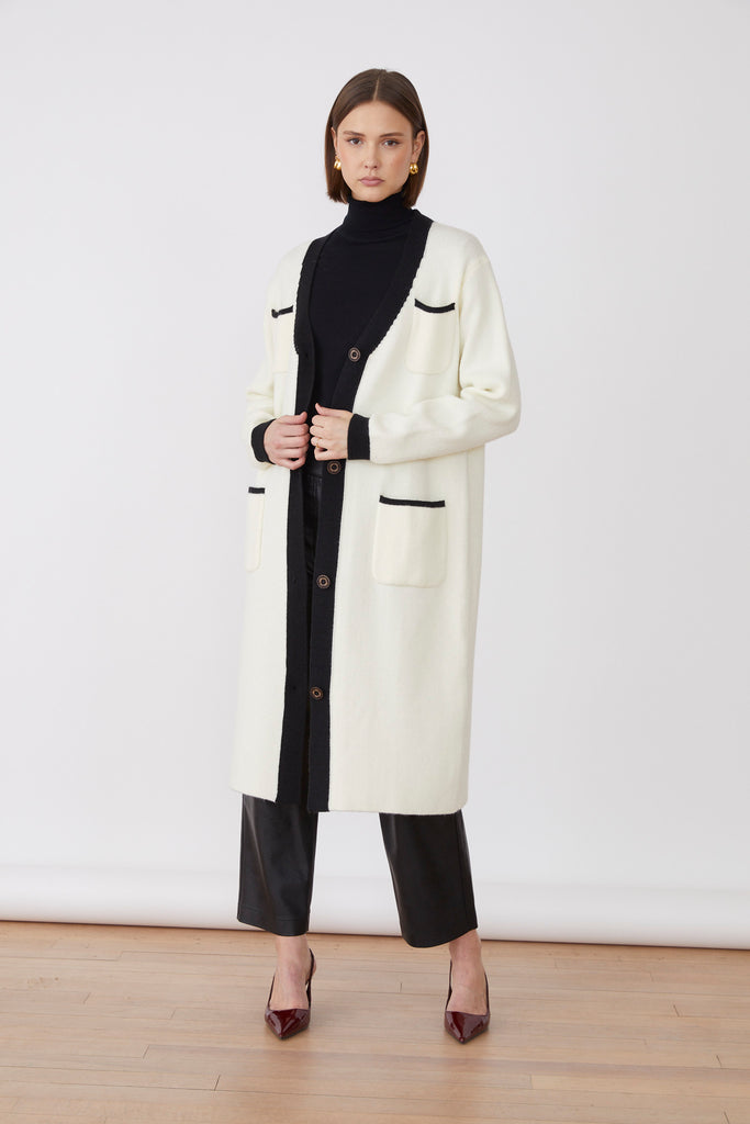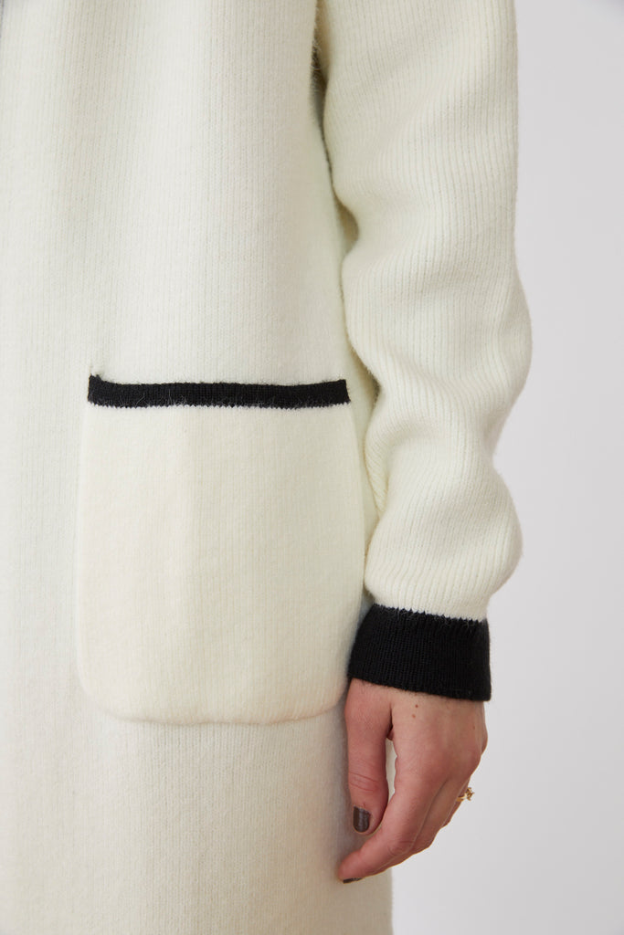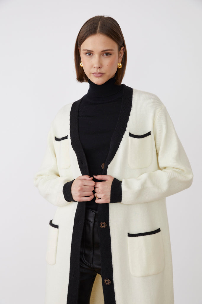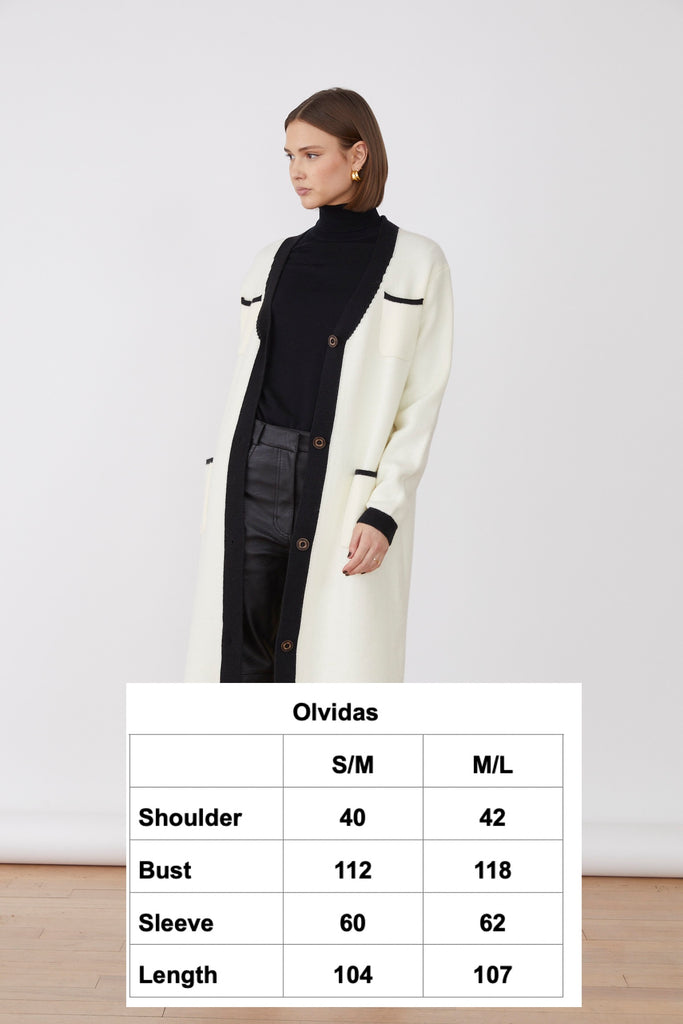 The Olvidas Cardigan white offers a perfect blend of cozy warmth and sophisticated design. Crafted as a button-down piece, it features a striking contrasting black outline that elegantly frames the garment, adding a refined touch to its rich brown hue. Functionality meets style with four thoughtfully placed pockets, providing both convenience and visual interest.
