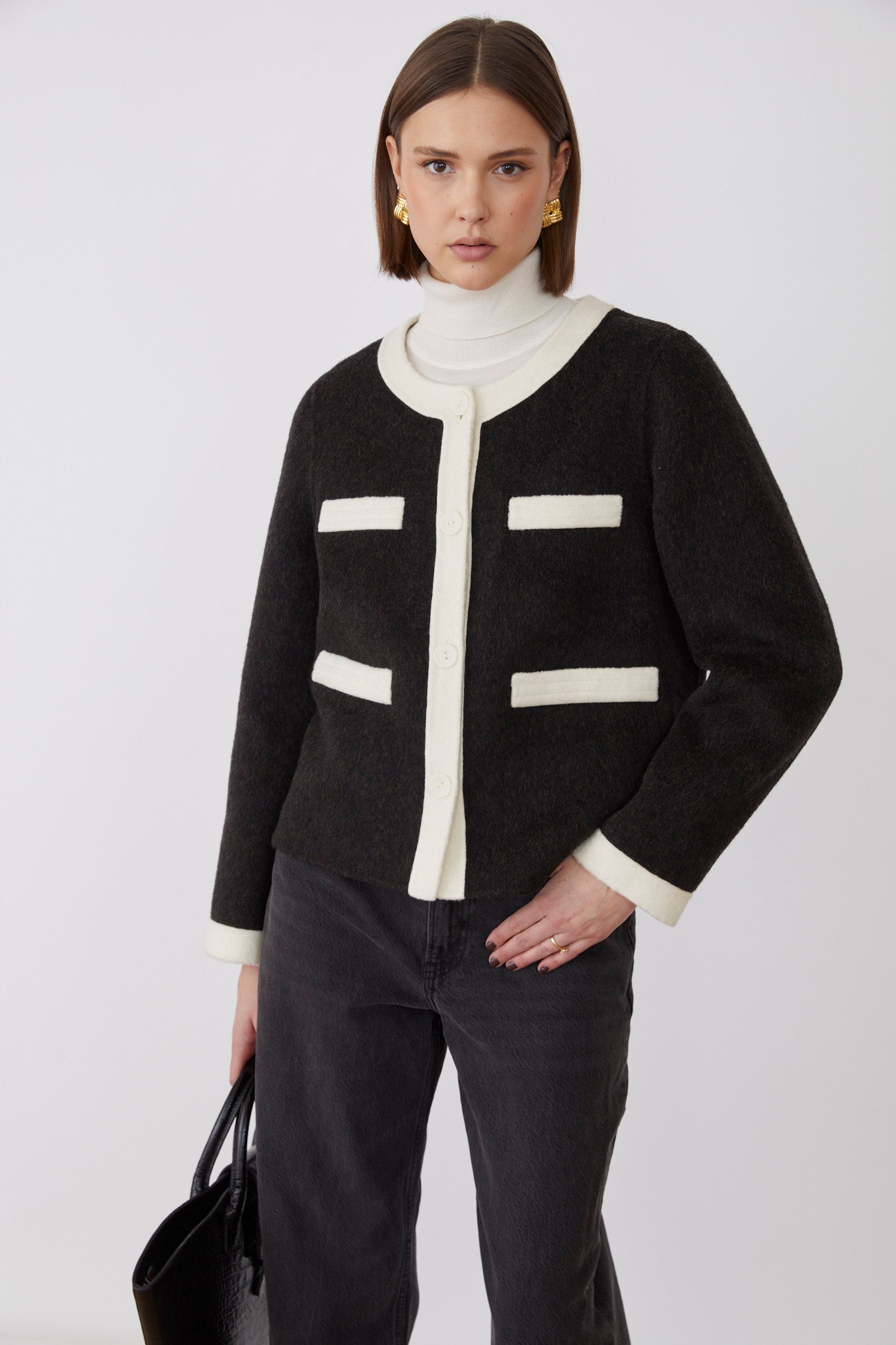 Elevate your wardrobe with the ROYSIN JACKET, crafted from a premium blend of 50% wool for warmth and durability. Its crisp white outlining adds a refined contrast, enhancing the jacket's sophisticated silhouette. Perfect for a polished, timeless look that effortlessly transitions from day to evening.