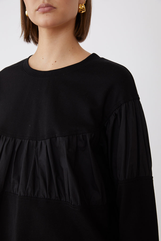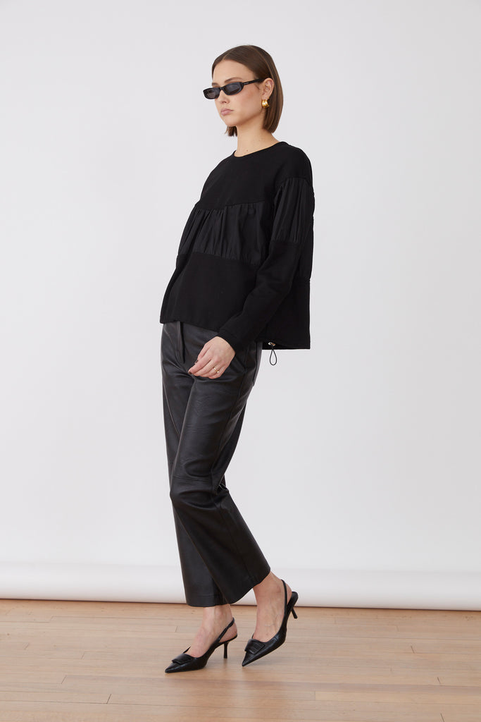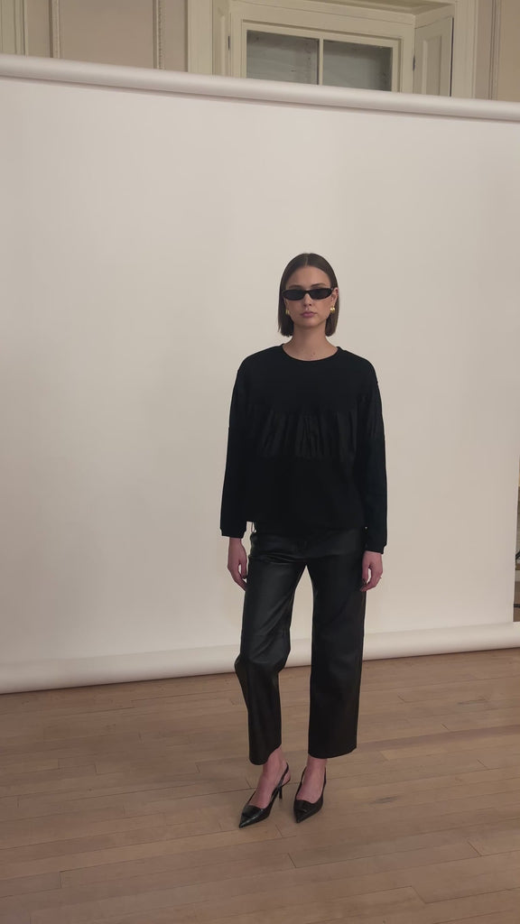The Roza Blouse Black combines elegance with contemporary design through its mixed materials and delicate long sleeves. Featuring voluminous detailing, this blouse adds a refined yet fashion-forward silhouette, perfect for elevating any sophisticated wardrobe.