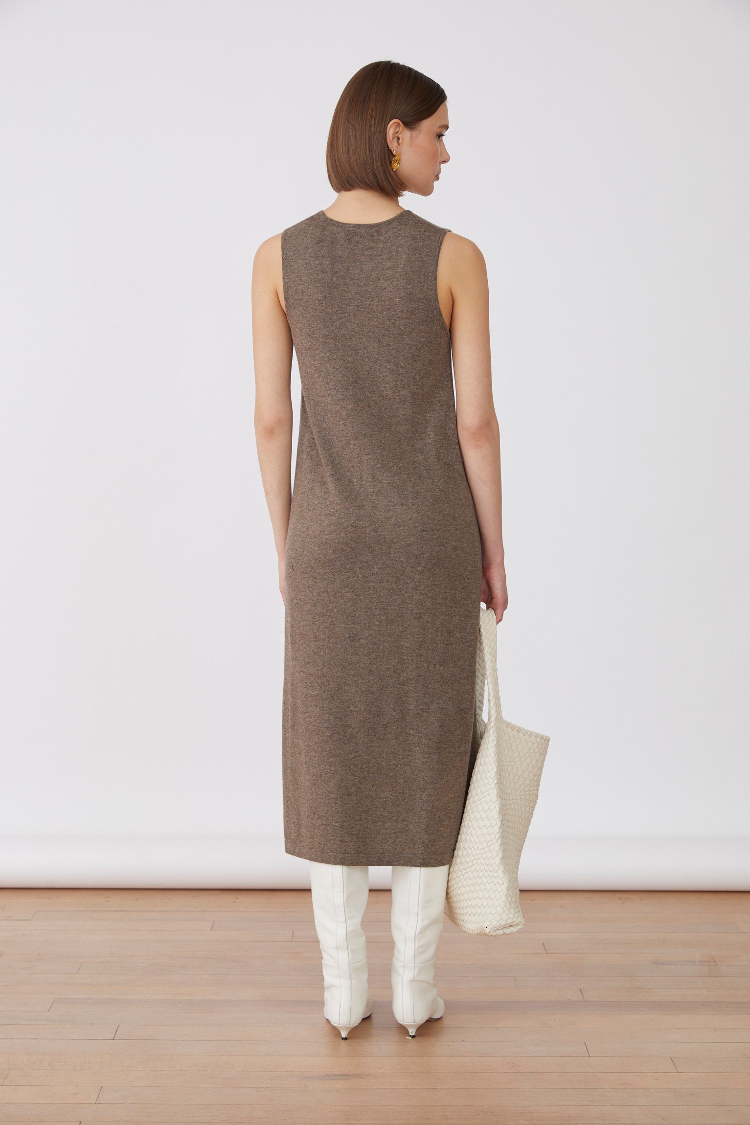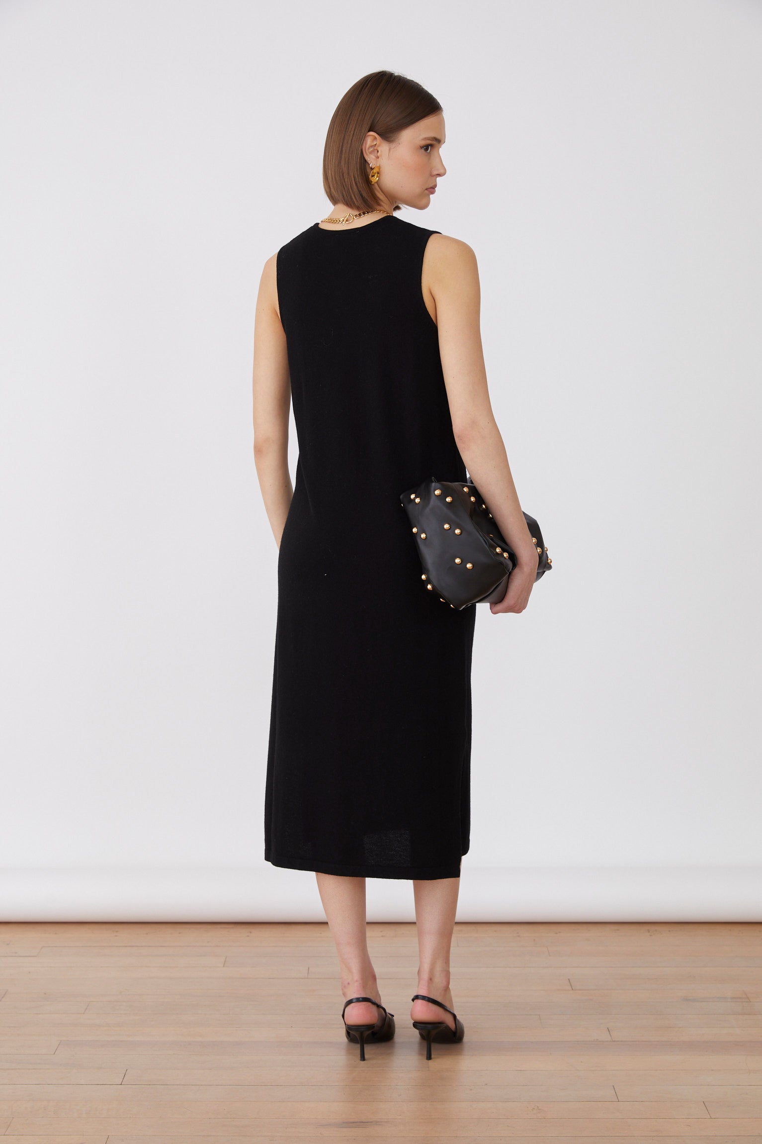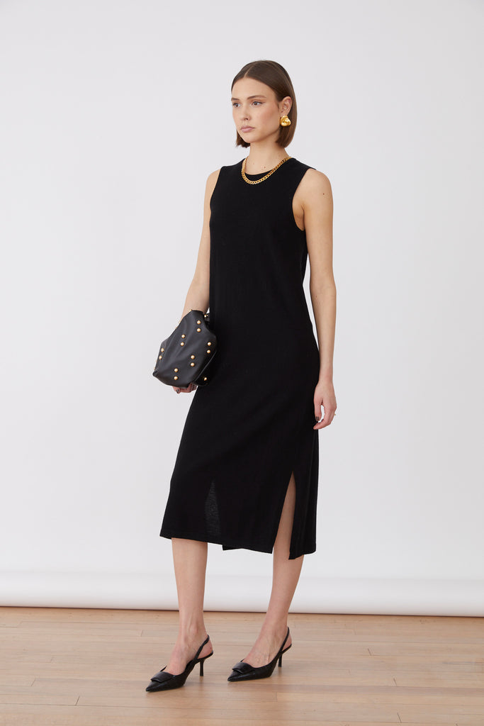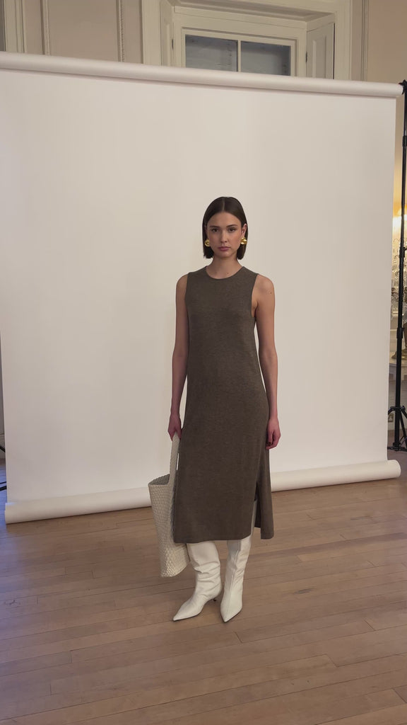 The Sheila Knitted Dress in taupe or black offers a refined silhouette with its sleeveless cut and elegant round neckline. Side slits provide subtle movement and a modern edge, making this dress an exquisite choice for a polished, sophisticated look.