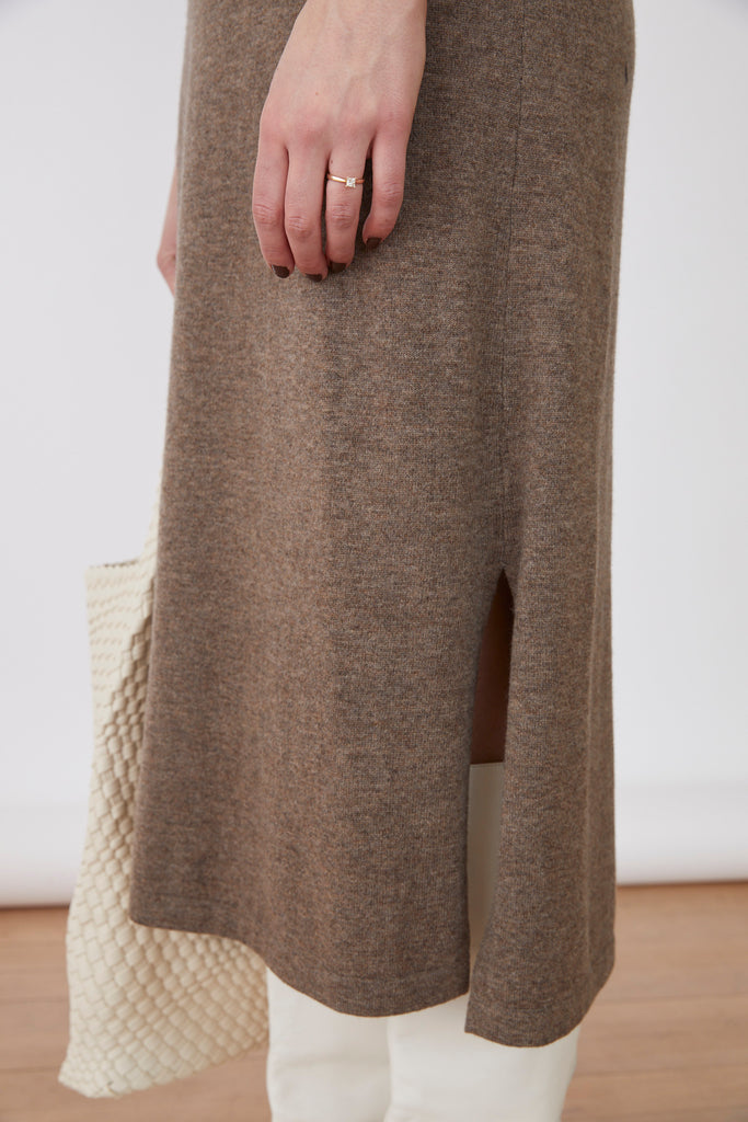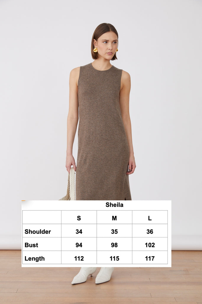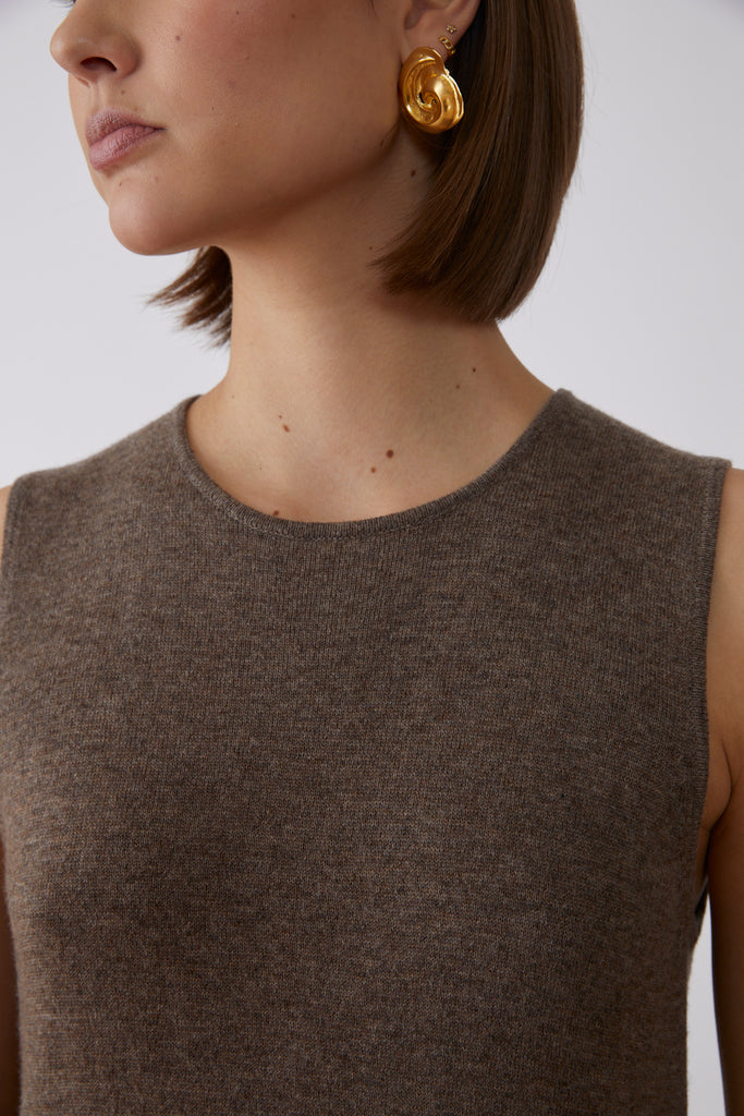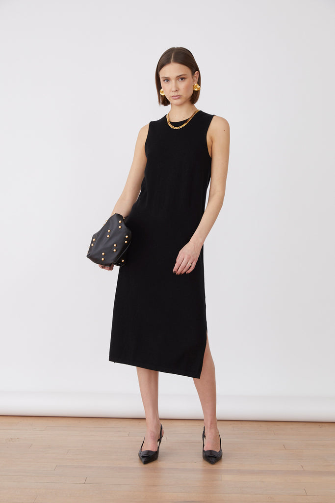 The Sheila Knitted Dress in taupe or black offers a refined silhouette with its sleeveless cut and elegant round neckline. Side slits provide subtle movement and a modern edge, making this dress an exquisite choice for a polished, sophisticated look.