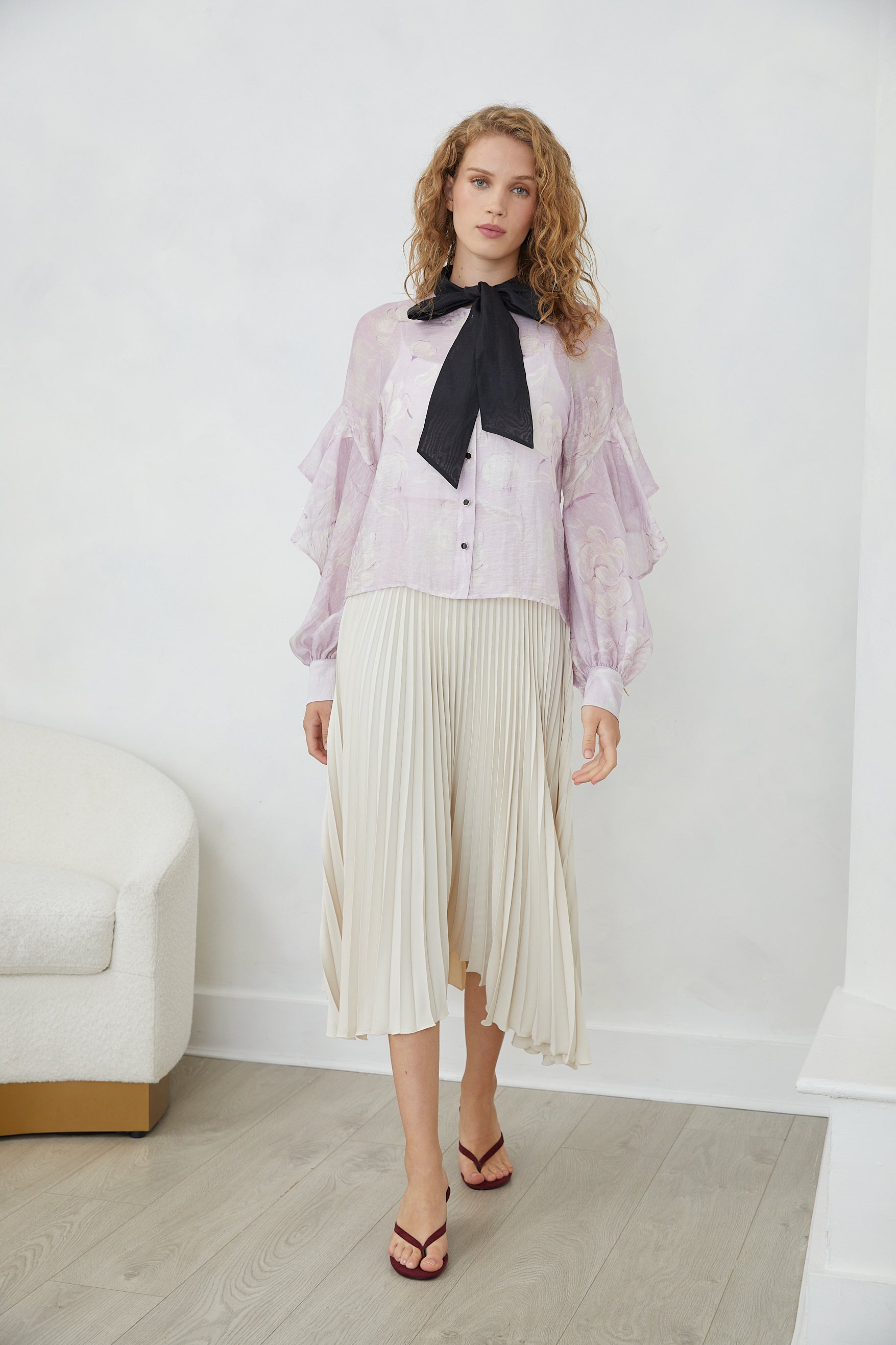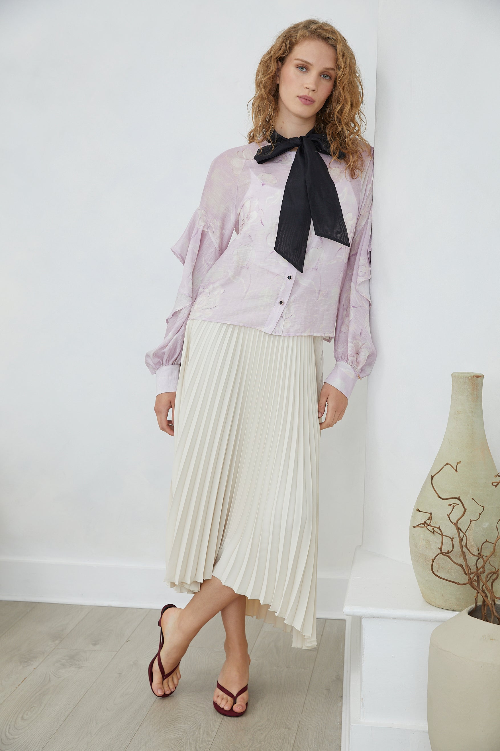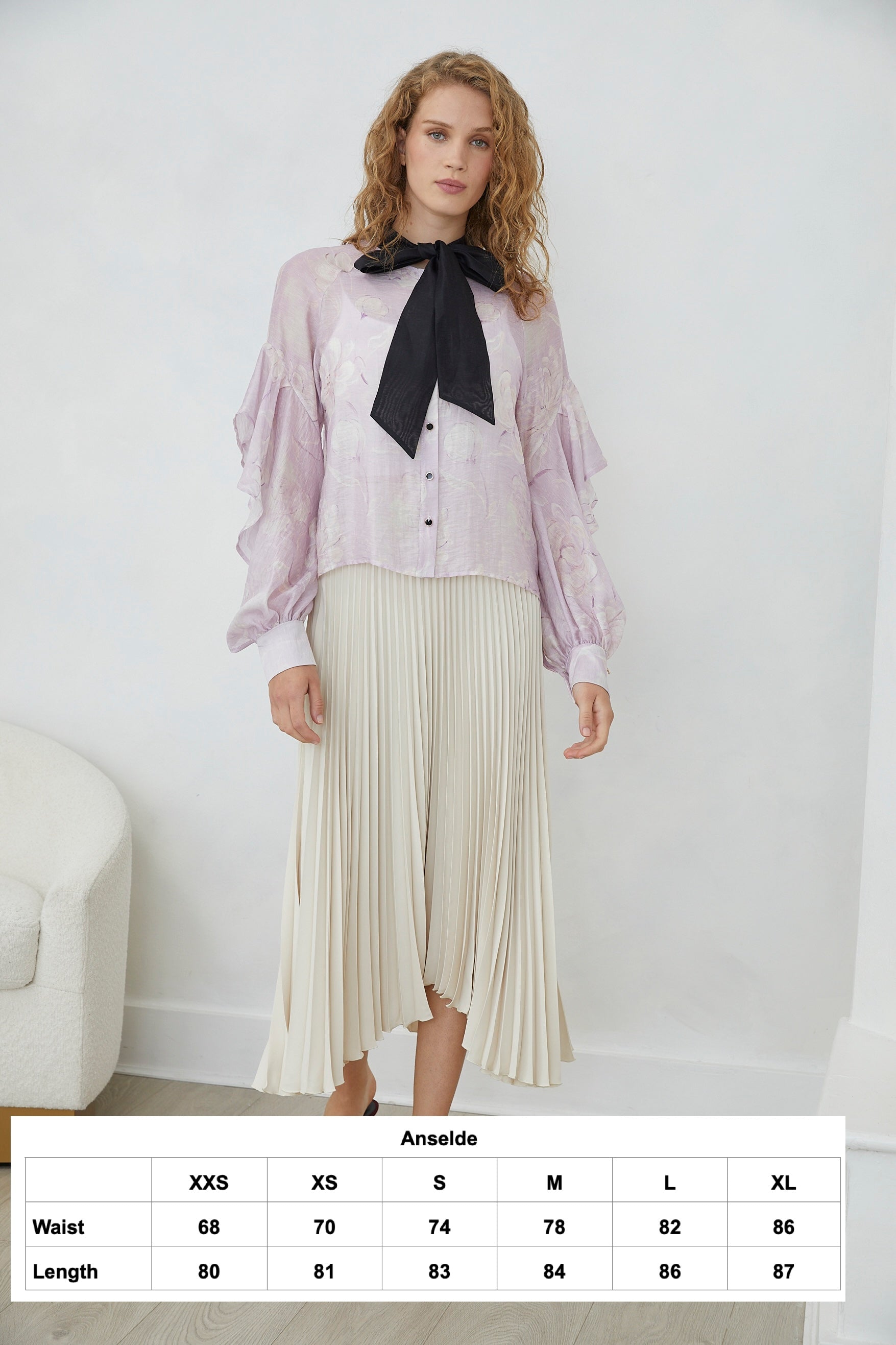 ANSELDE SKIRT An understated midi silhouette defined by fluid pleating and asymmetric proportions. Crafted in a refined cream tone, this piece balances structure with movement, offering a contemporary take on tailored elegance. The asymmetric cut creates visual intrigue whilst the pleated detailing ensures graceful drape. A versatile investment for elevated everyday wear and occasion dressing alike.