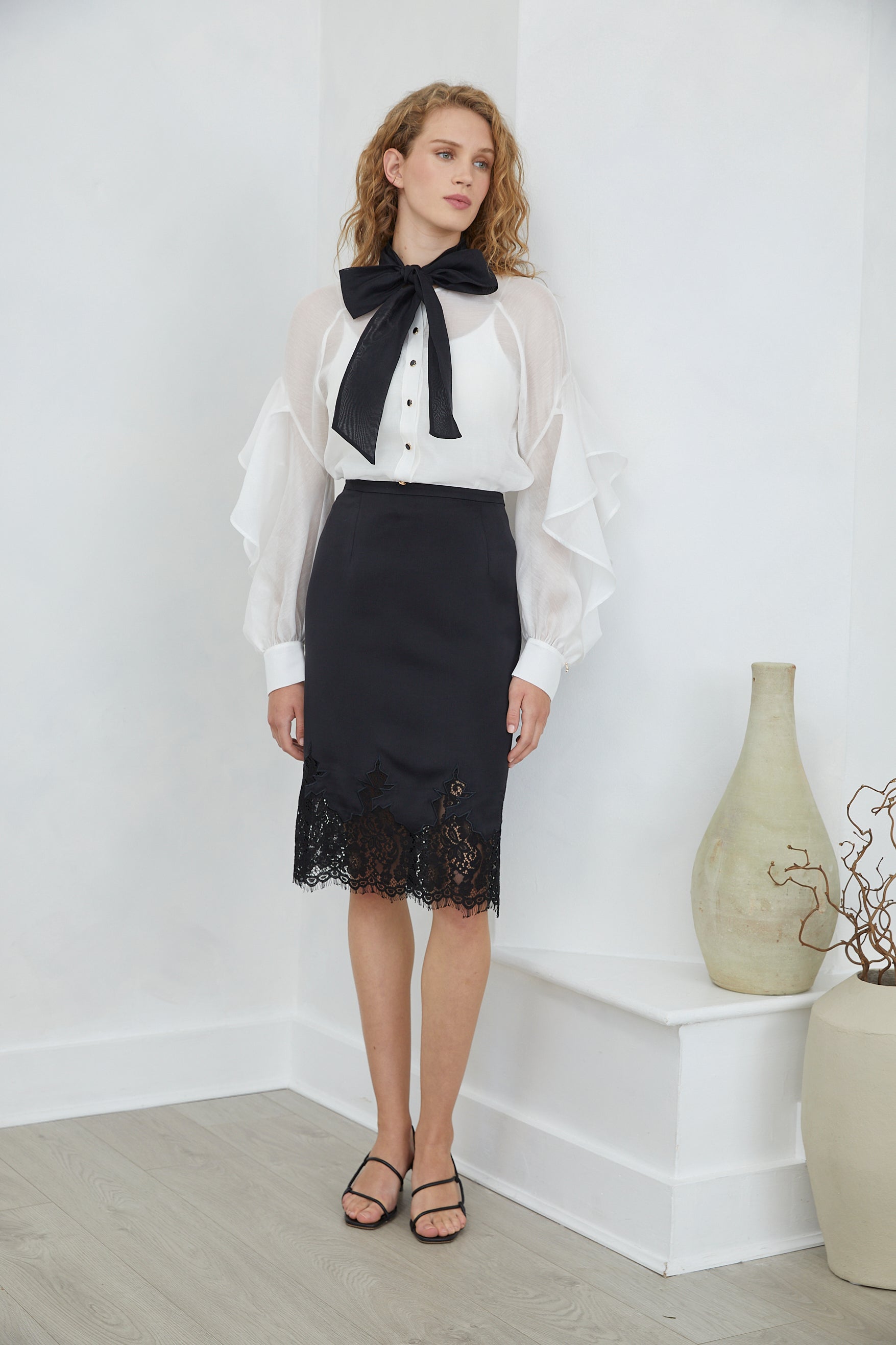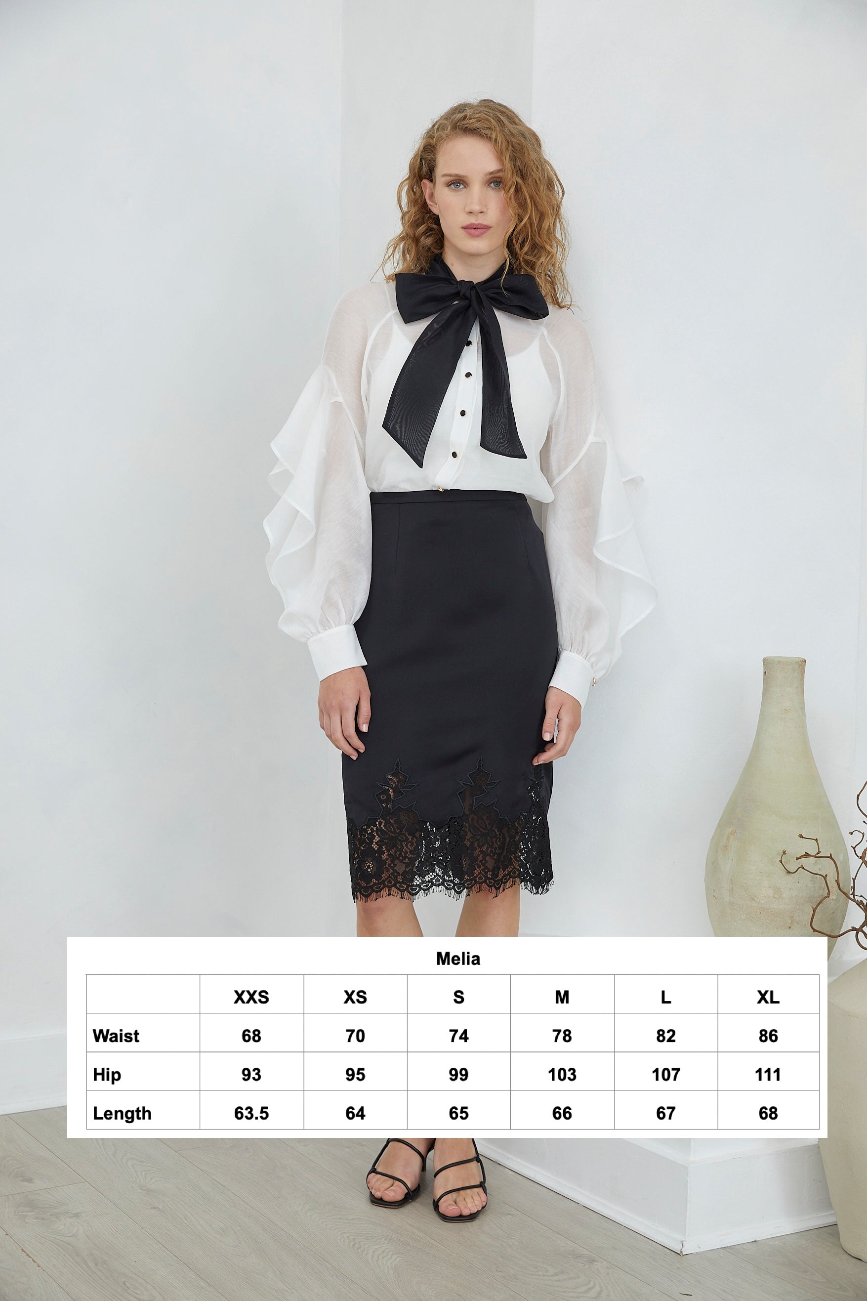 The MELIA SKIRT combines timeless elegance with contemporary silhouette. This midi pencil skirt features refined lace detailing at the hem, adding an understated touch of femininity to a structured design. Perfect for elevated everyday wear or professional occasions, it pairs effortlessly with tailored tops and statement accessories. The fitted cut flatters the figure while the midi length offers versatile styling options across seasons.