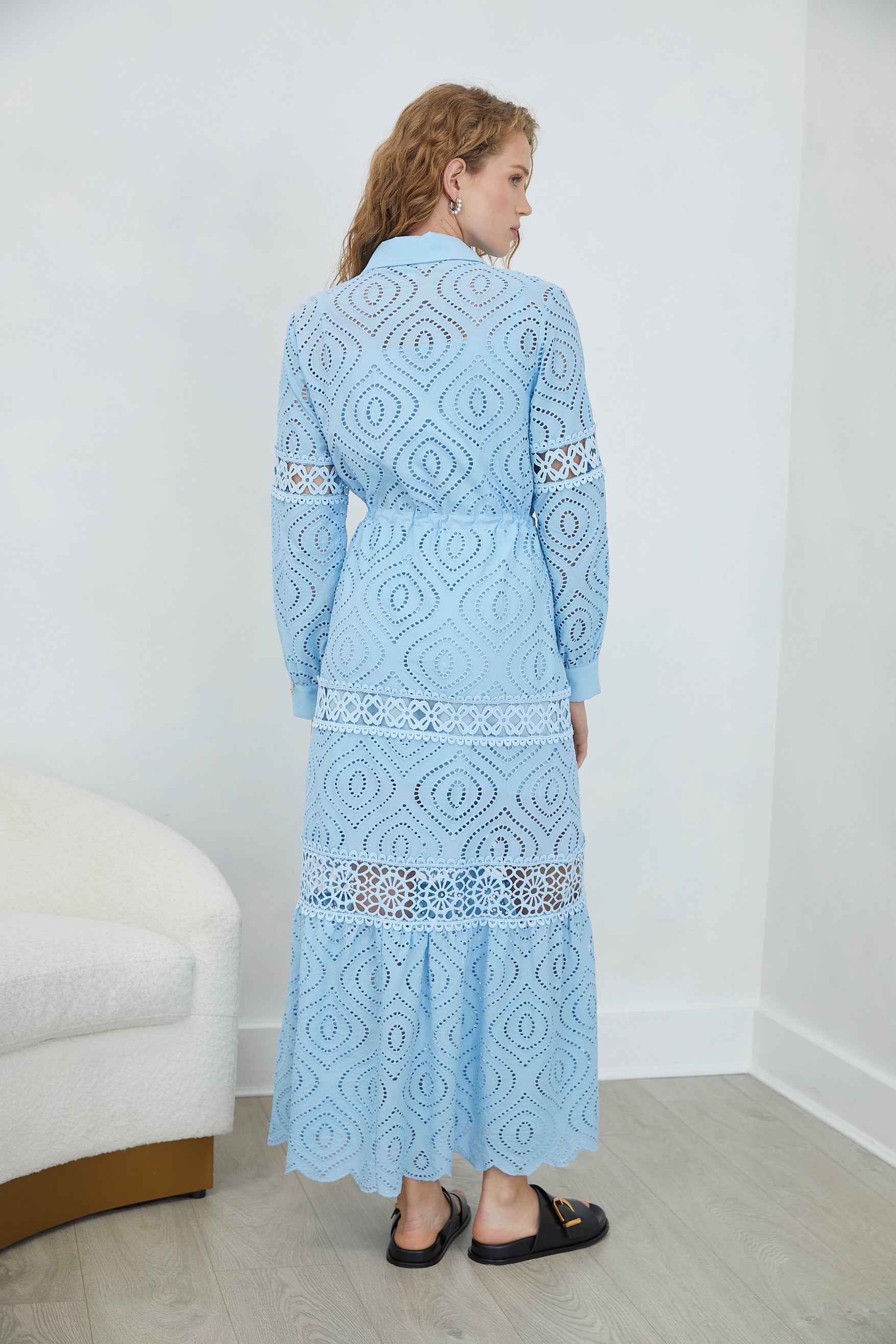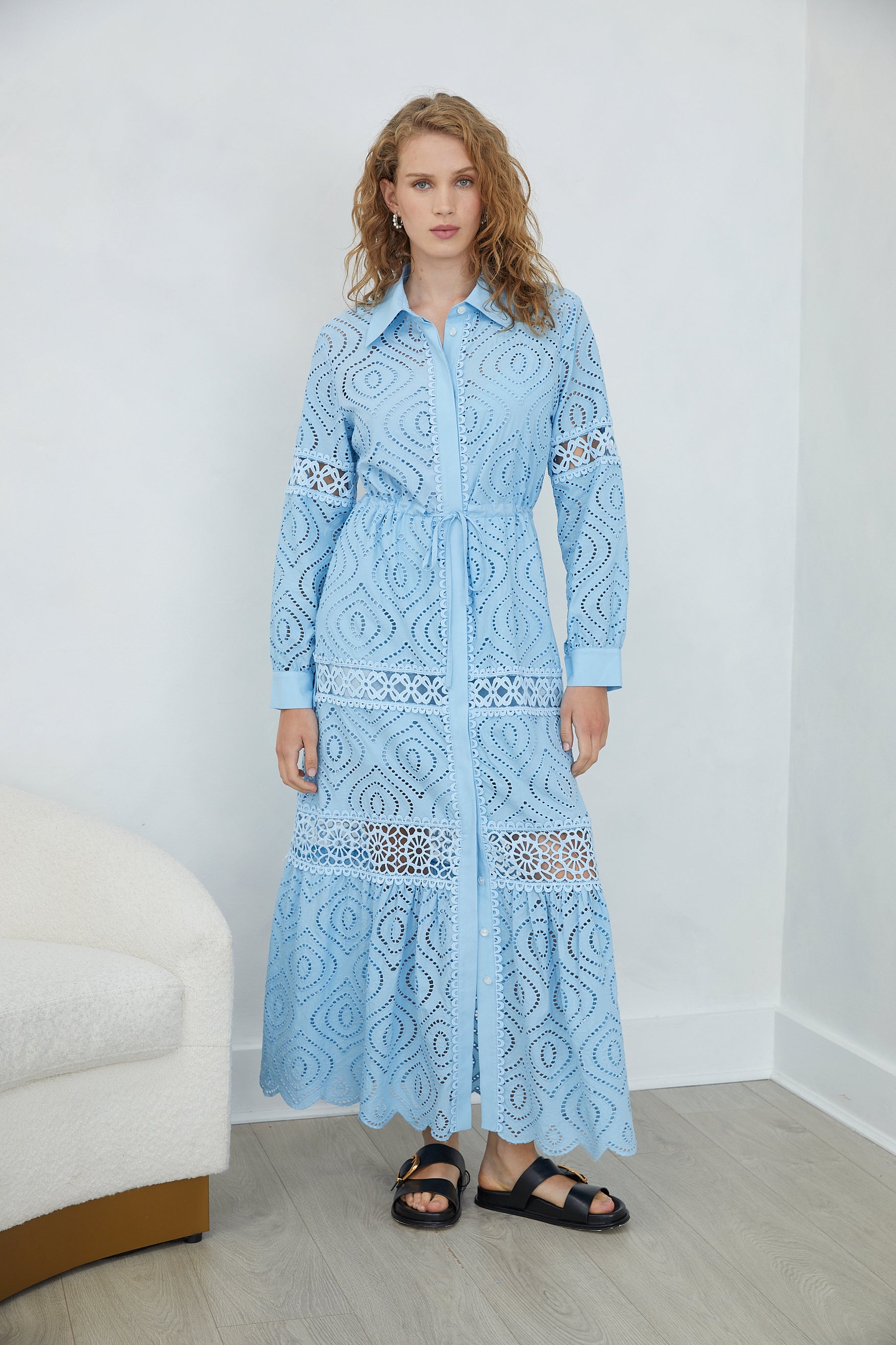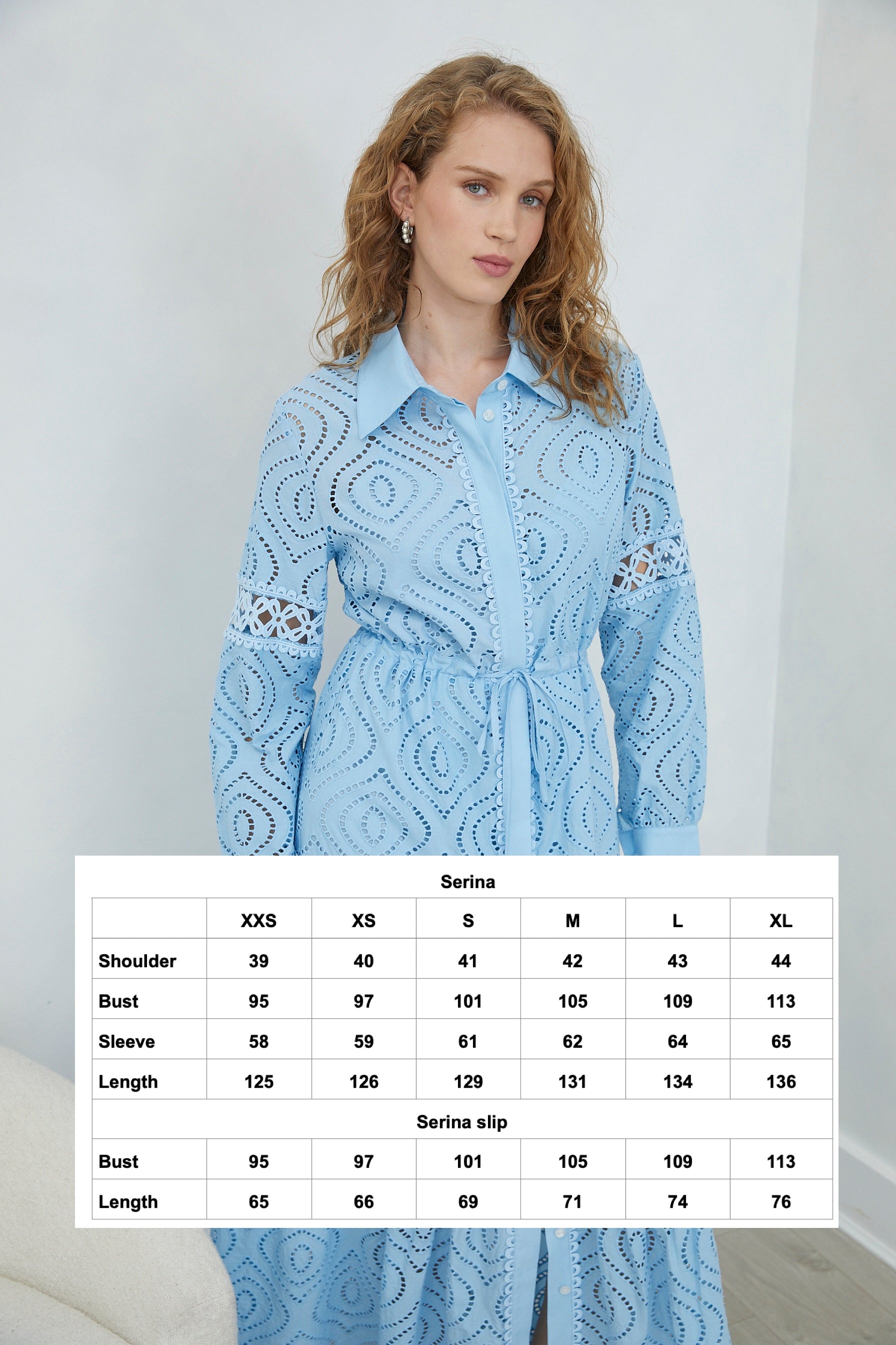 The SERINA DRESS combines timeless elegance with refined detailing. Crafted with delicate embroidery anglaise, this piece features a flattering tie waist that defines the silhouette and a classic button-down front for effortless styling. Perfect for elevated daywear or occasion dressing, the intricate eyelet work adds texture and visual interest while maintaining a sophisticated aesthetic. A versatile wardrobe essential that transitions seamlessly from season to season.