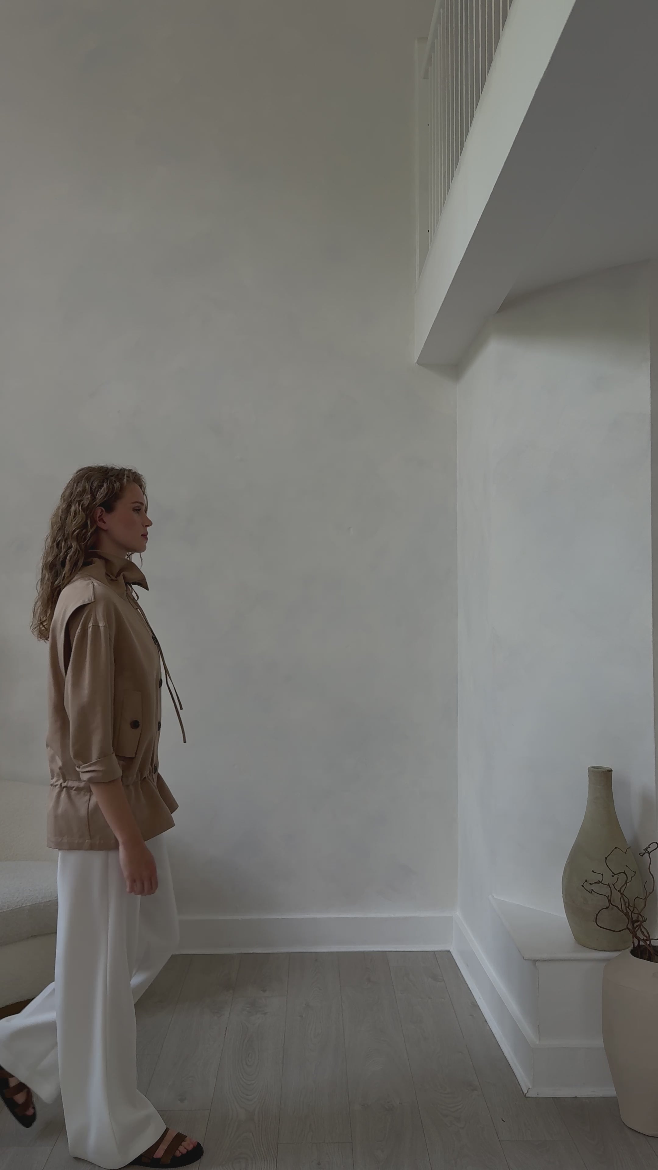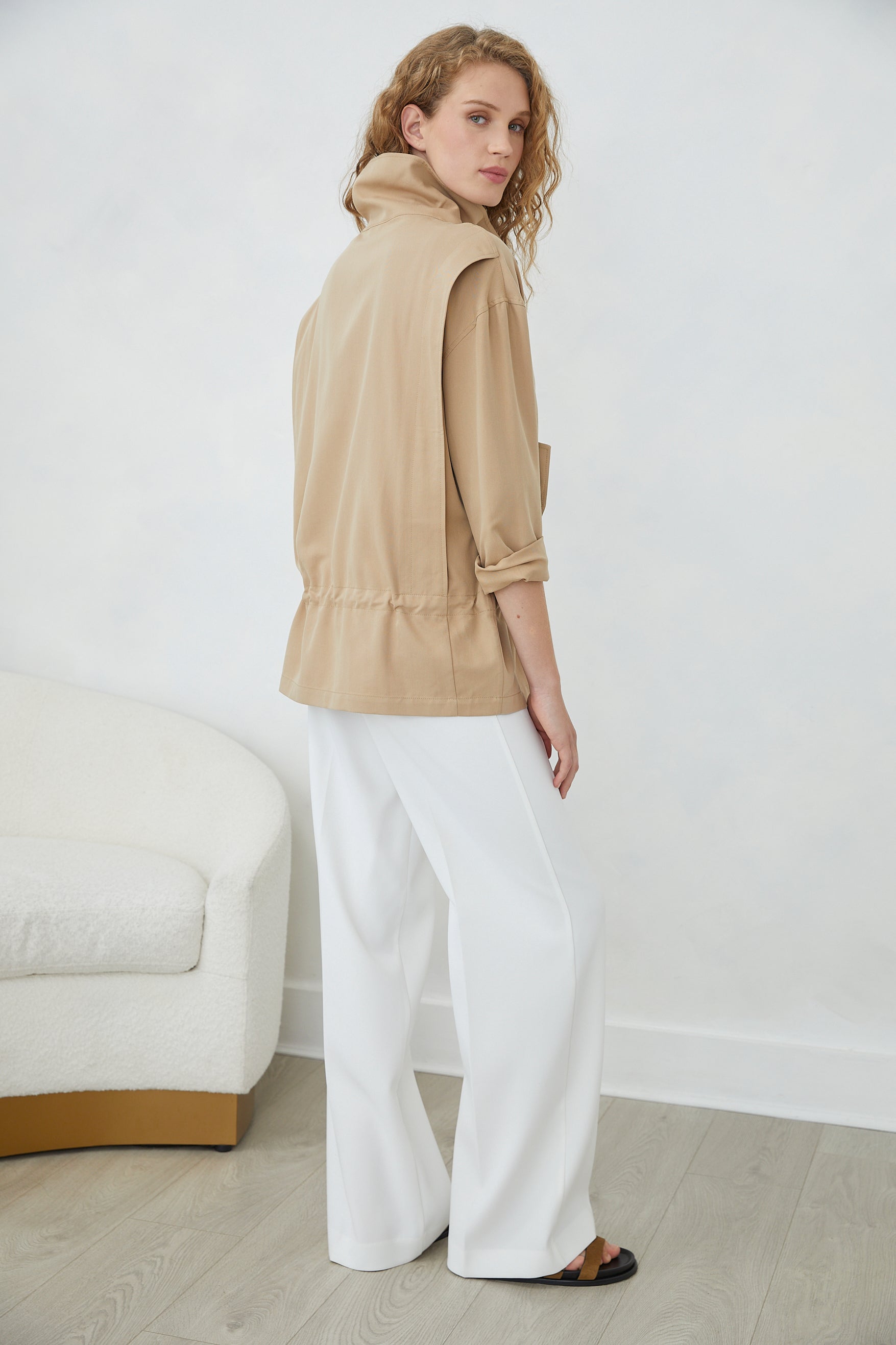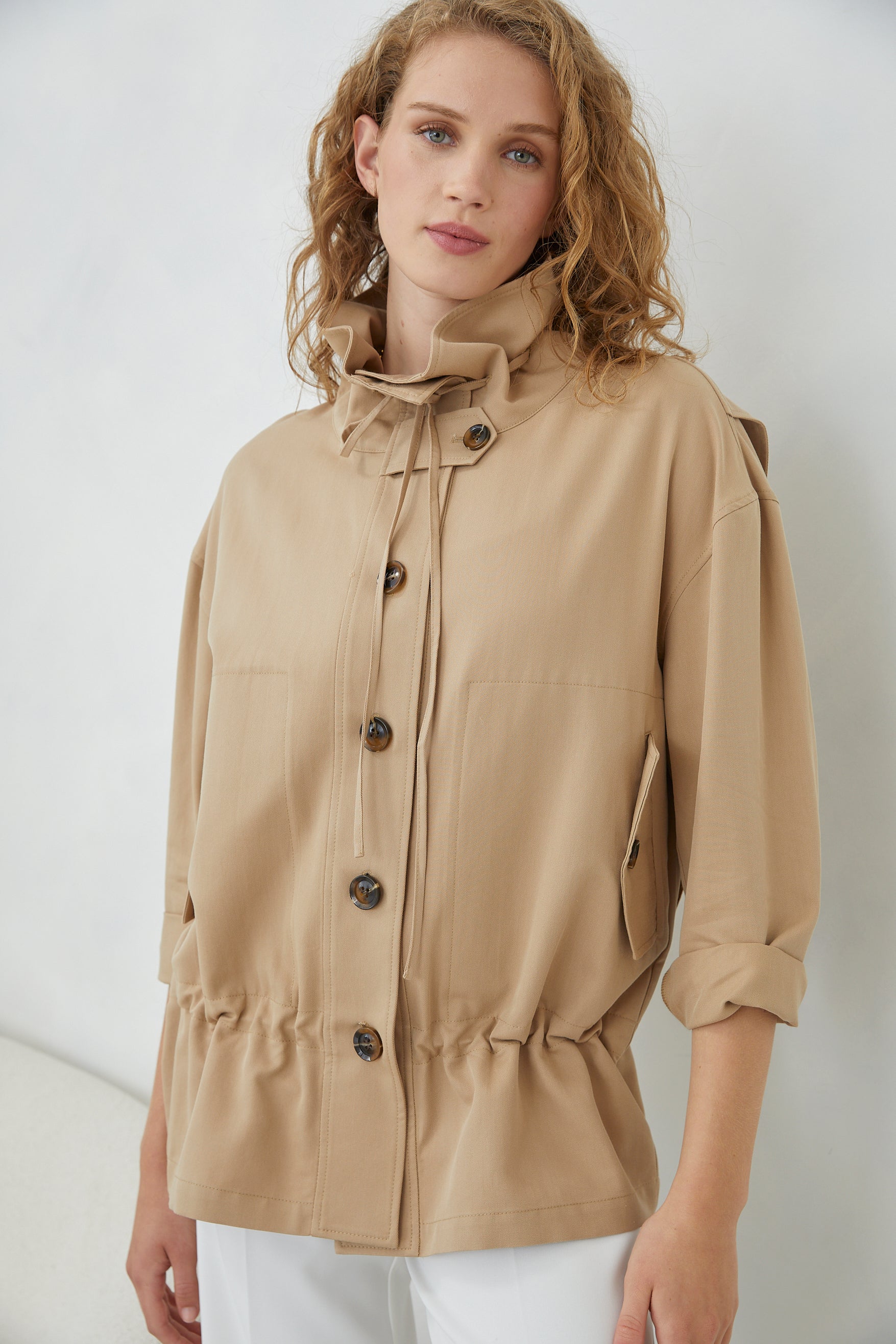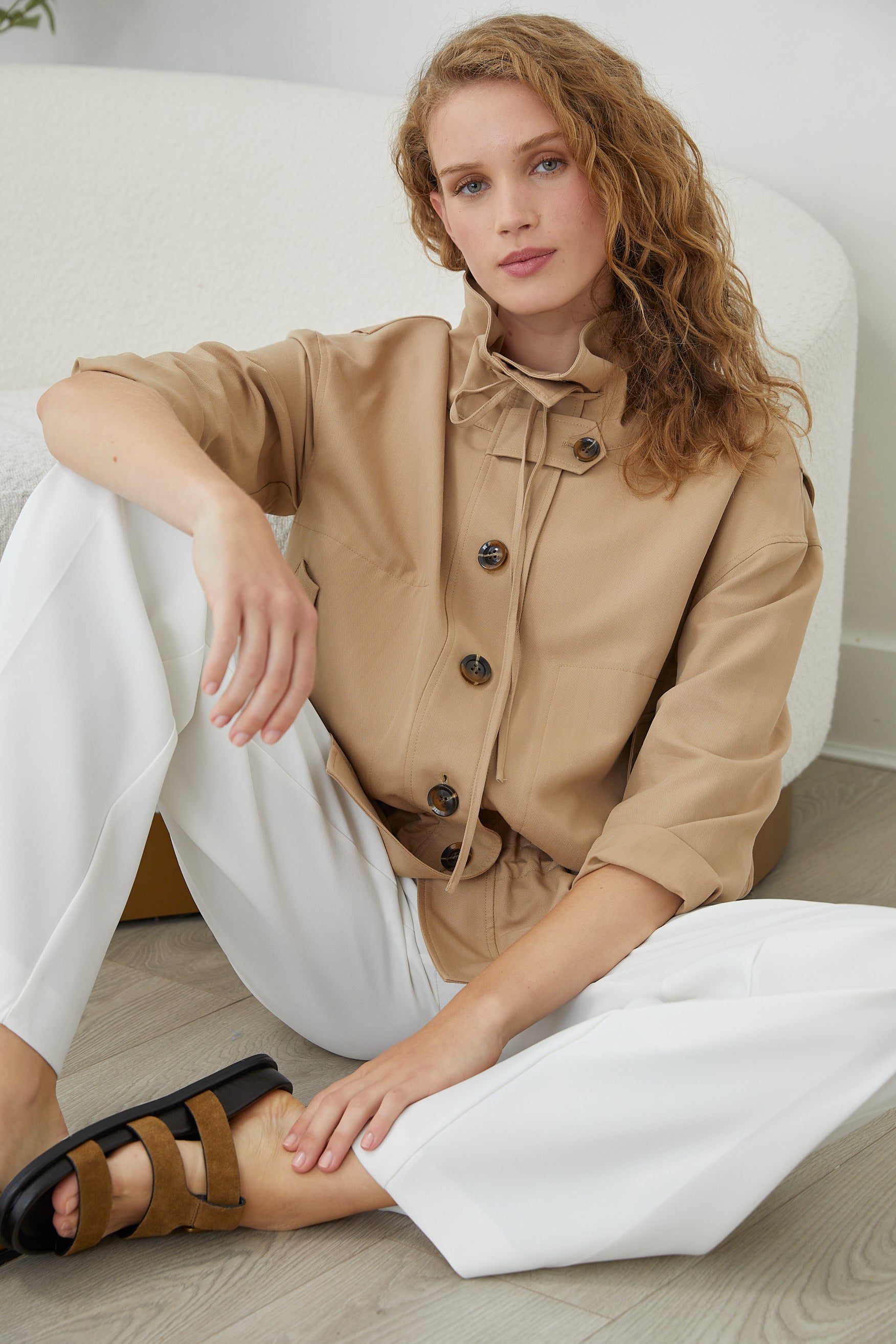 A refined jacket that commands attention through considered design details. The tie-on collar offers versatile styling—wear it fastened for polished formality or loosened for effortless elegance. Functional button-down front ensures easy layering, while the adjustable tie waist creates a flattering silhouette that transitions seamlessly from day to evening. Crafted for the discerning wearer who values both structure and movement.