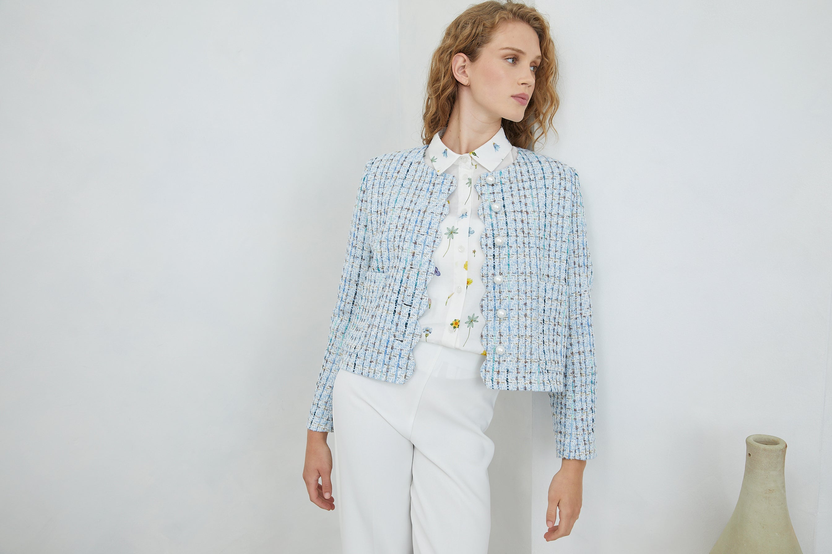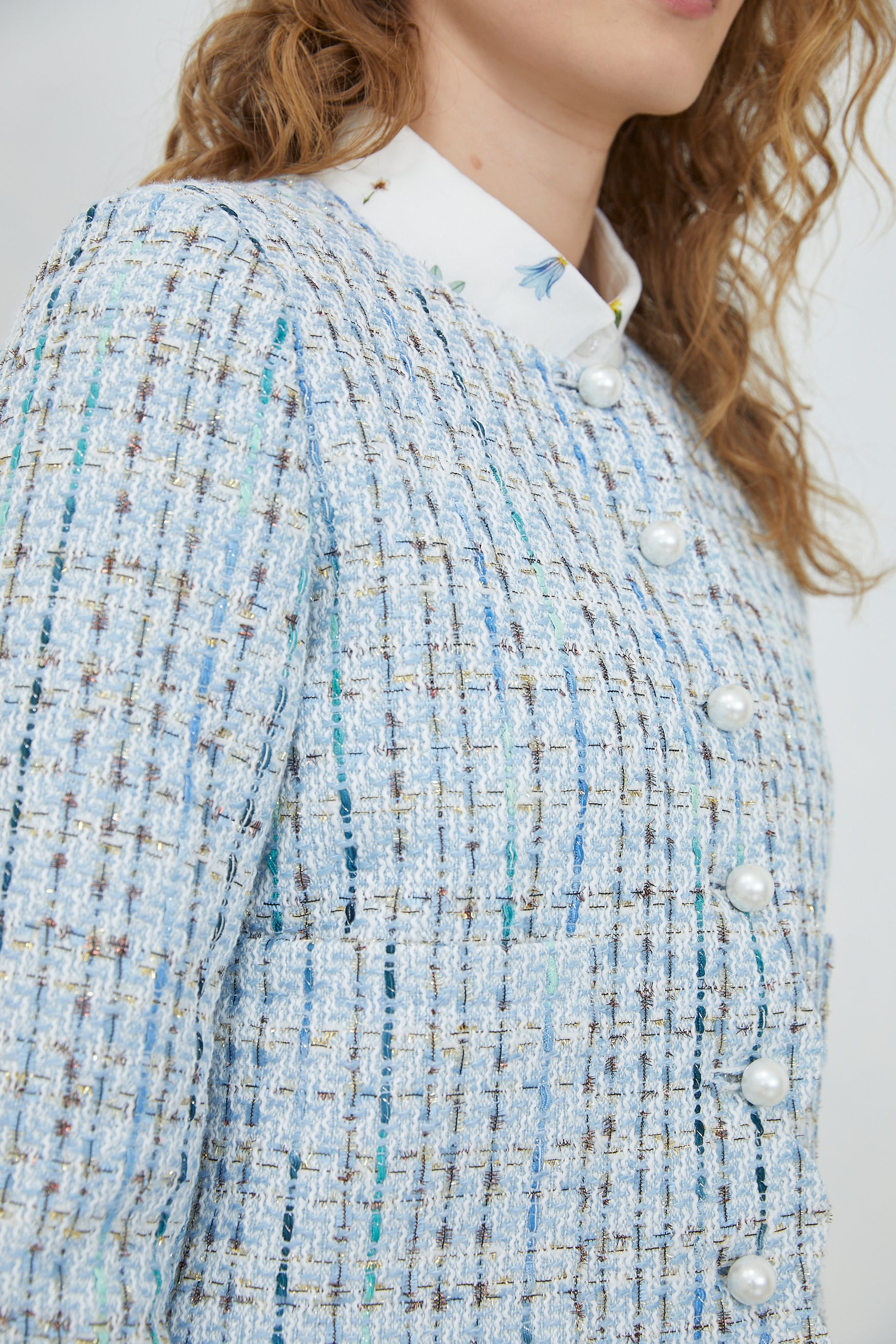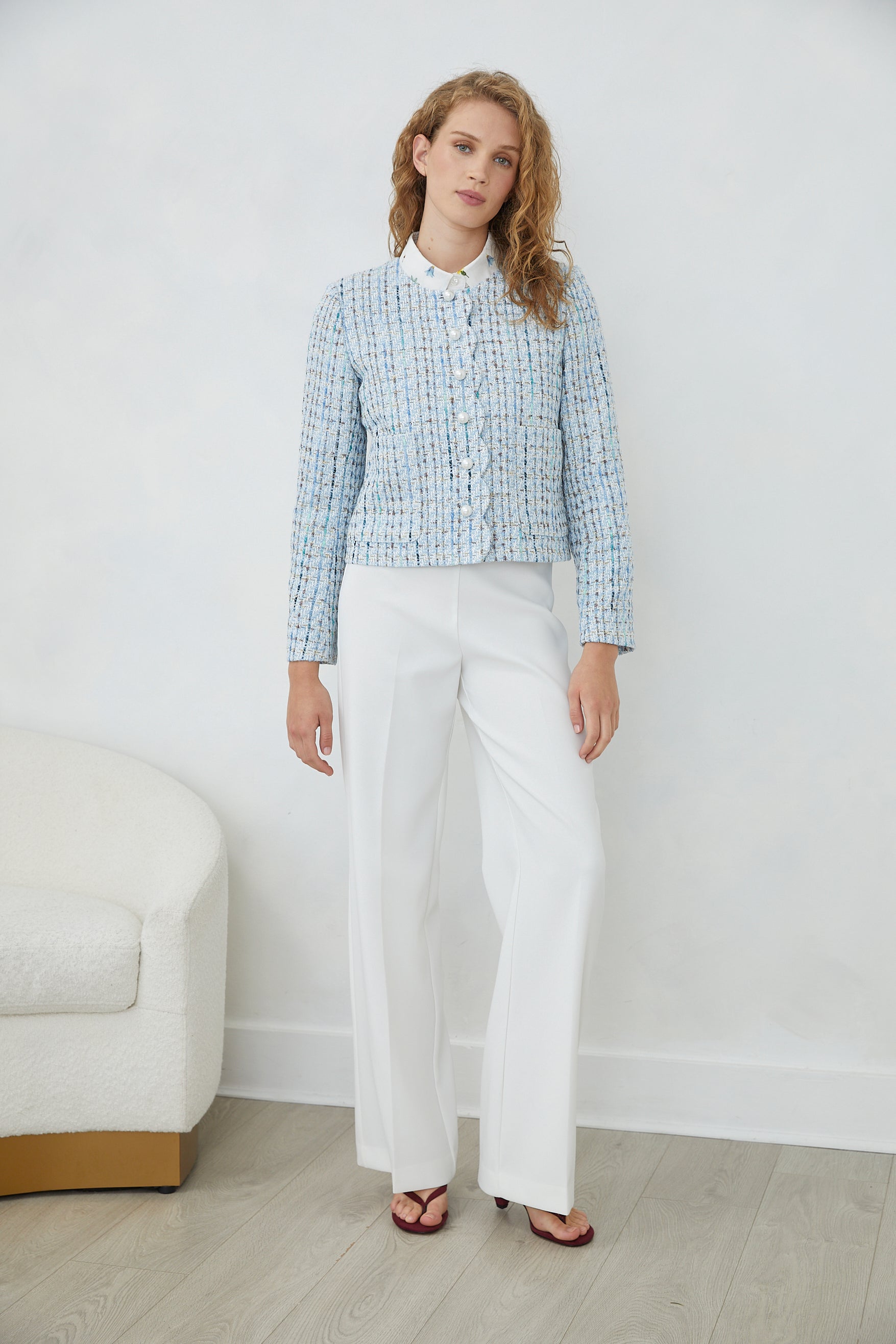 The TESSARA JACKET channels timeless elegance through its refined tweed construction, elevated by lustrous pearl buttons that catch the light with understated luxury. Practical front pockets offer functional sophistication, making this piece as wearable as it is striking. A wardrobe essential that bridges classic tailoring with contemporary ease.