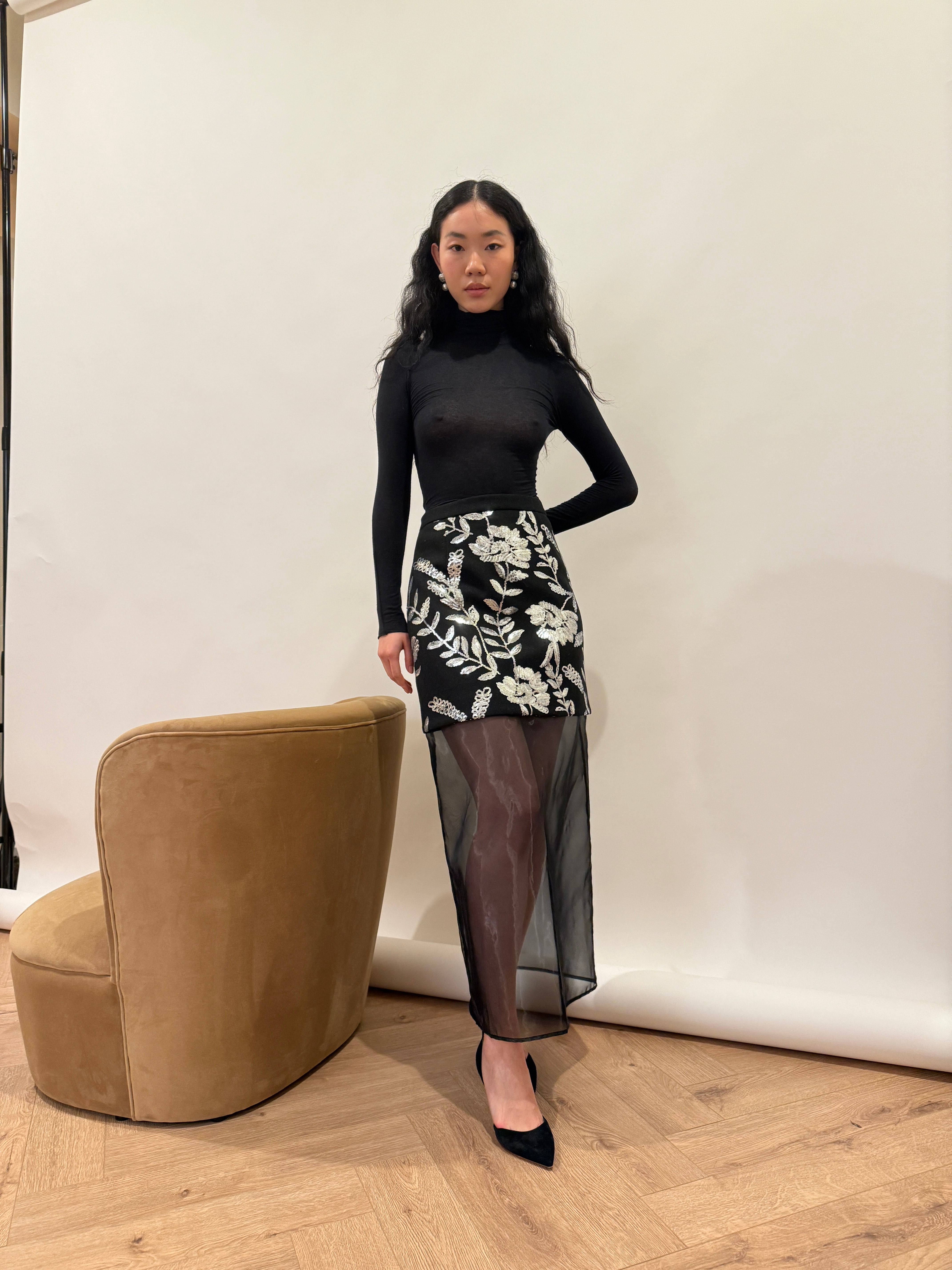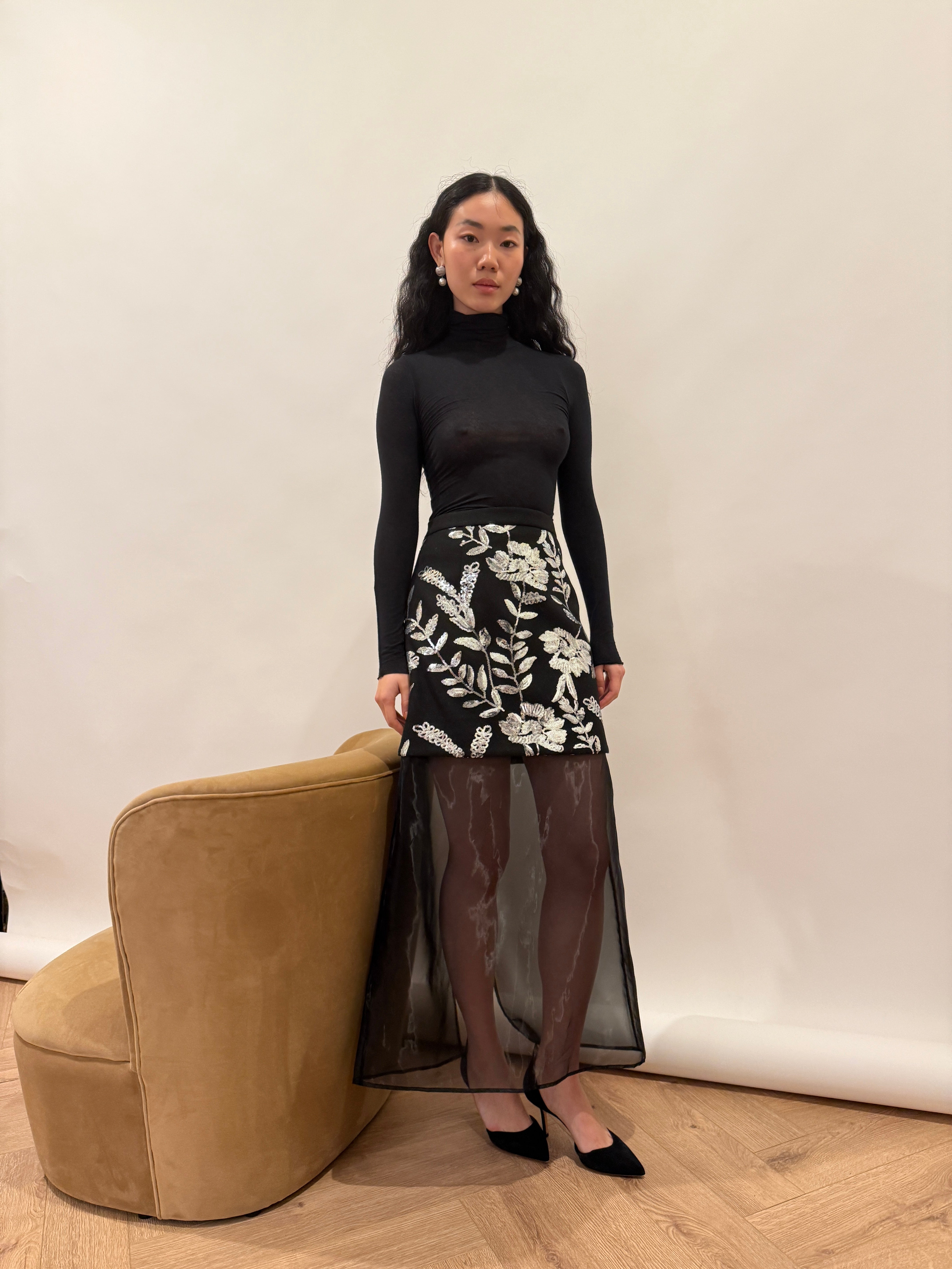 The SOLEI SKIRT features delicate floral embellishments adorned with shimmering sequins, creating an elegant and festive look. Its midi length and sheer lining add a touch of sophistication, making it perfect for special occasions and celebrations.